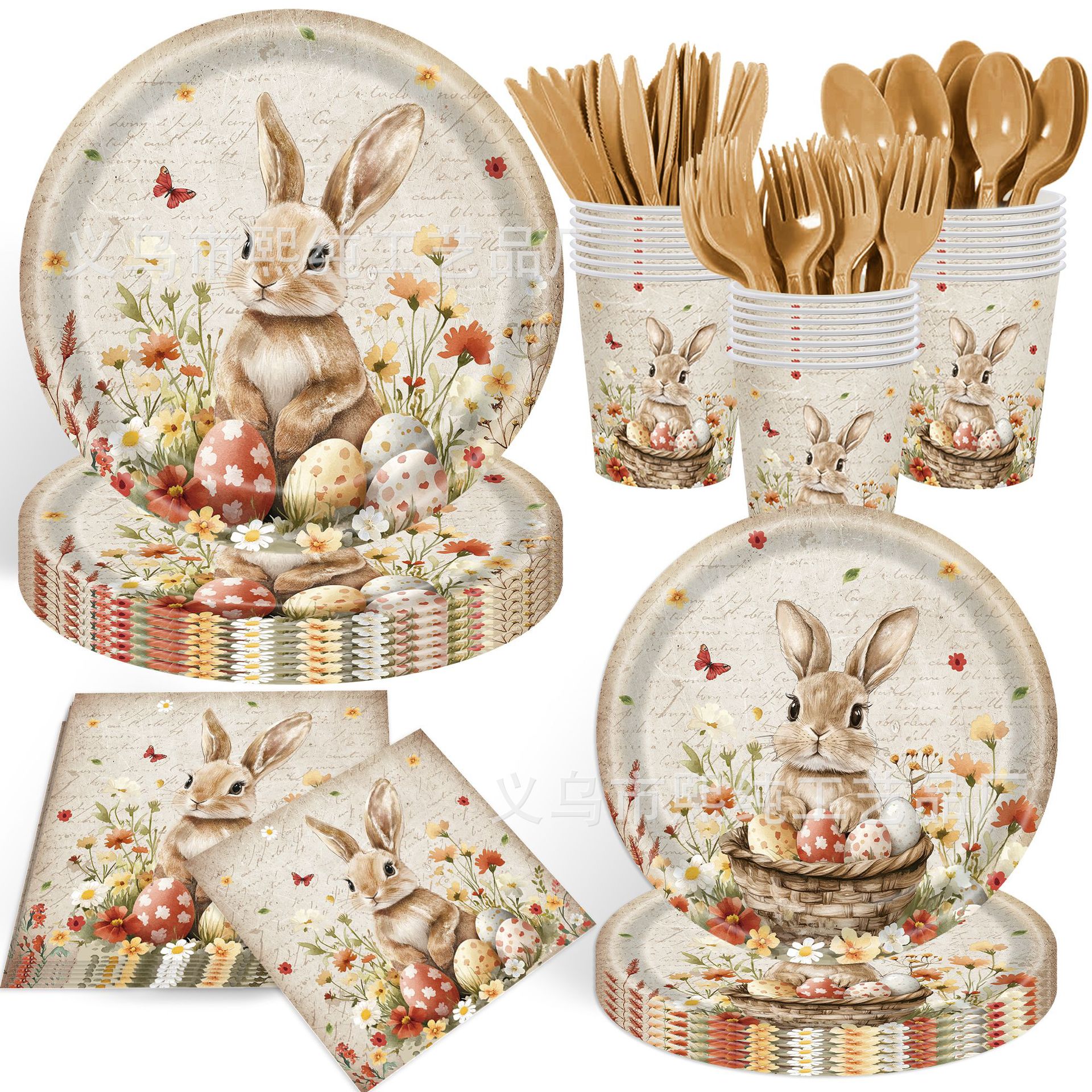 新款复活节可爱兔子彩蛋派对主题亚马逊一次性纸杯纸盘纸巾派对用