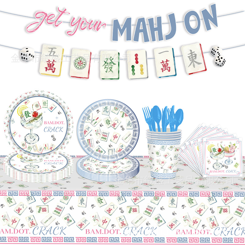 跨境麻将中国风派对用品麻将派对装饰节日纸盘纸杯桌布一次性装饰