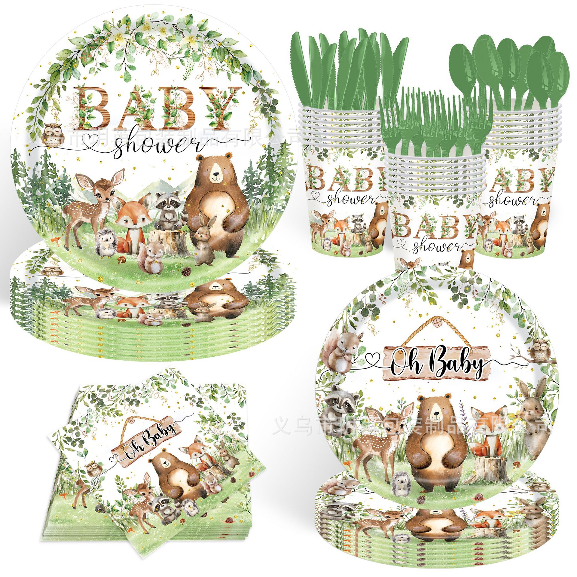 丛林动物生日派对纸盘餐具套装一次性纸巾纸杯布置绿色透明餐桌