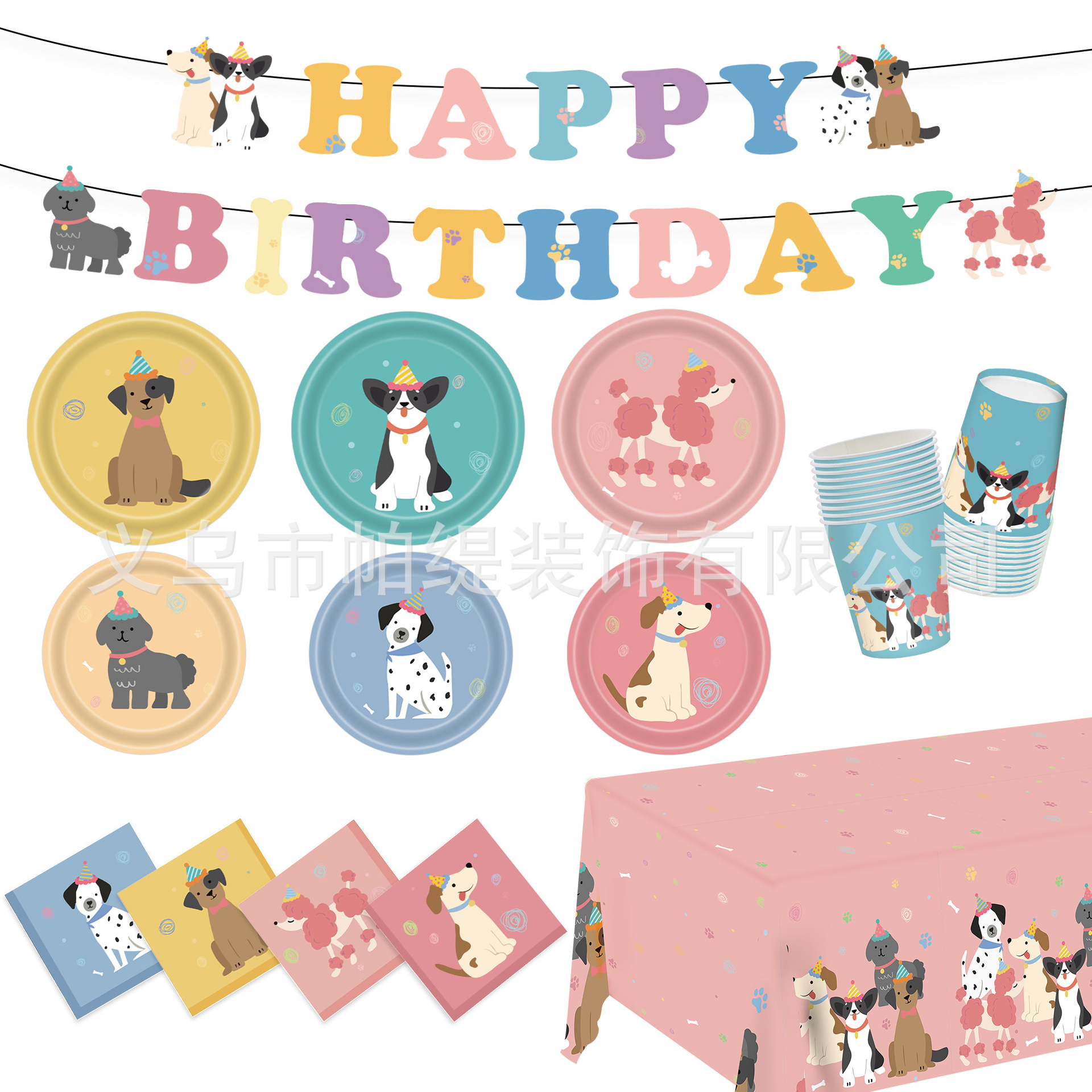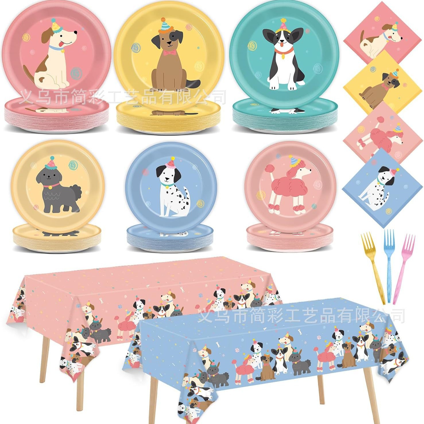 跨境新款卡通宠物儿童生日派对装饰用品复古小狗纸巾桌布布置套装