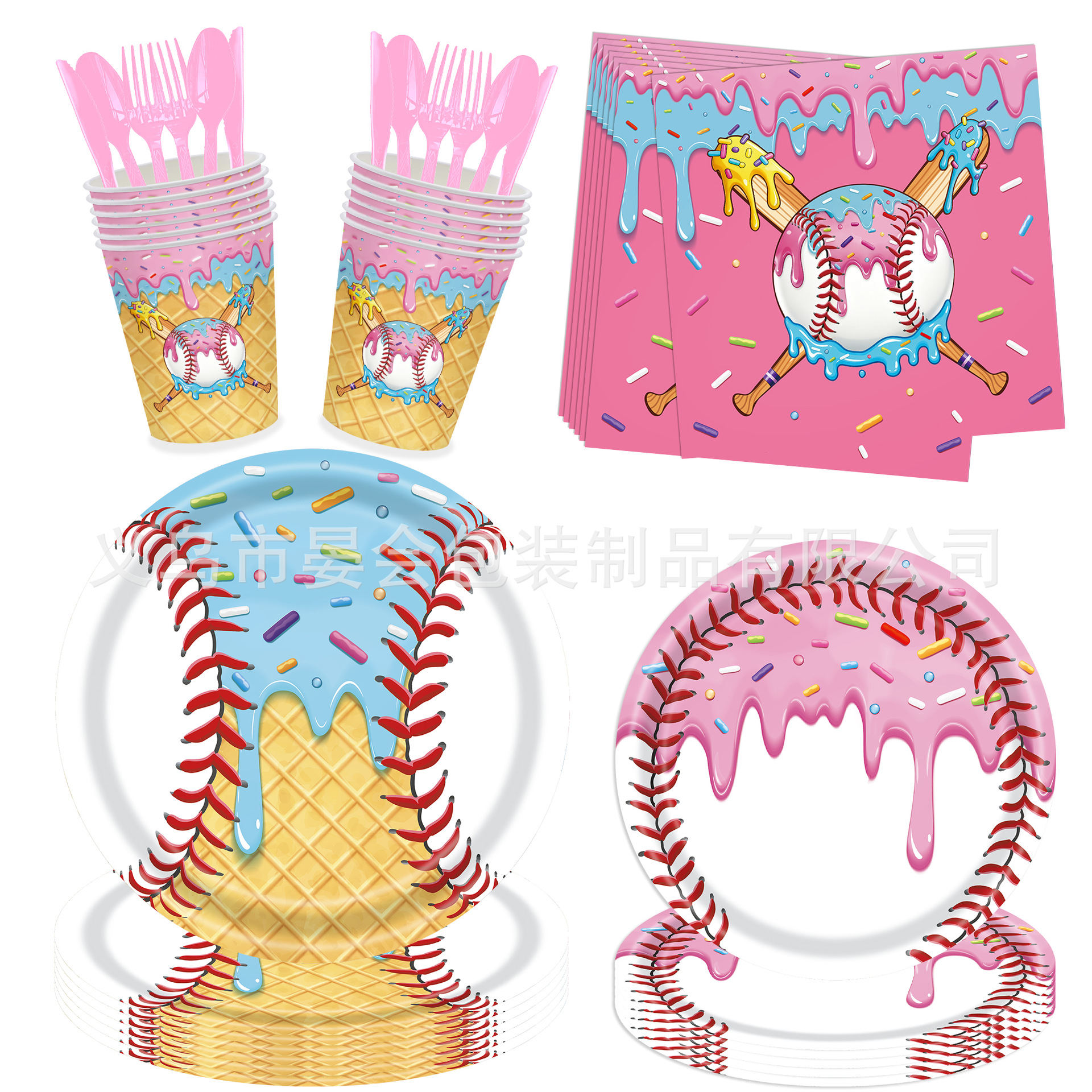 新款棒球蓝粉冰淇淋主题生日派对纸盘纸巾纸杯桌布等餐具套装派对
