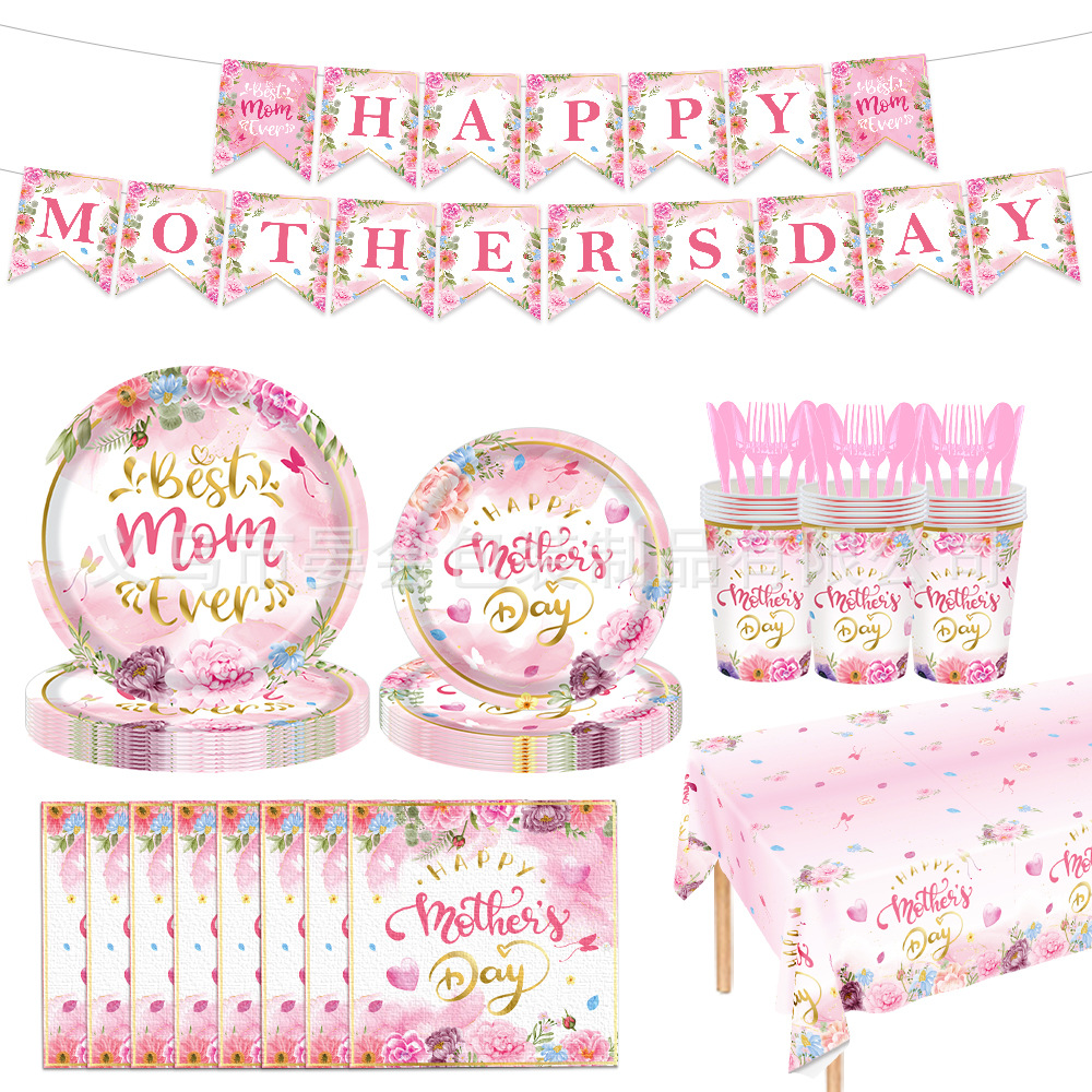 新しい母の日ピンクの花パーティー紙皿紙皿ティッシュテーブルクロスなどの使い捨て食器用品
