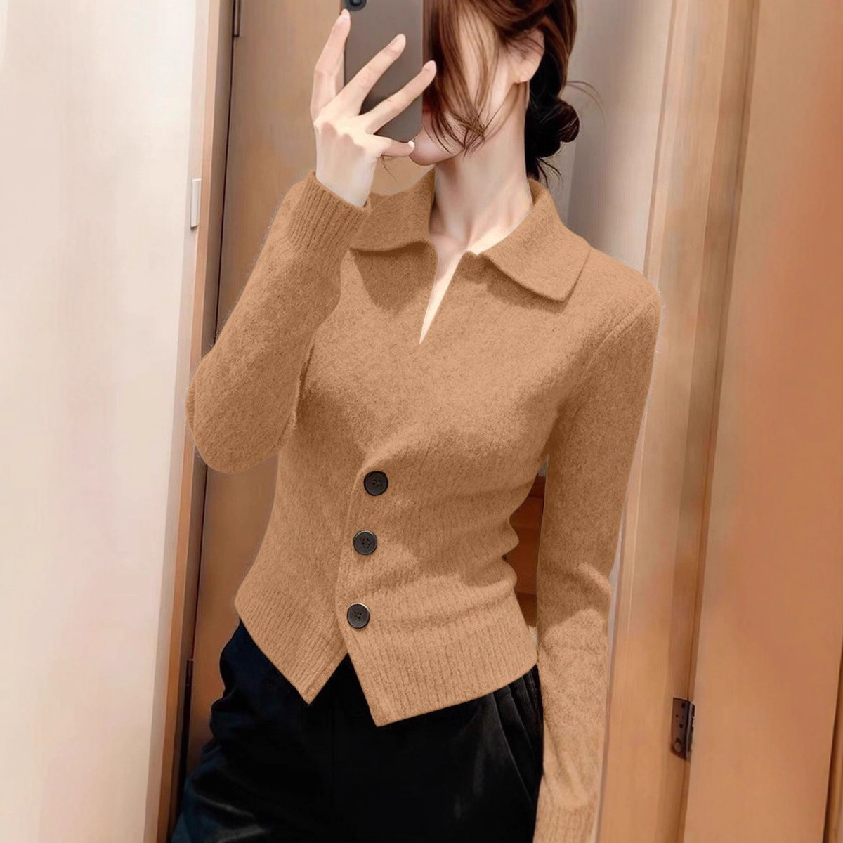 法式简约复古翻领纯色修身长袖针织衫女2025冬季新款小众打底上衣