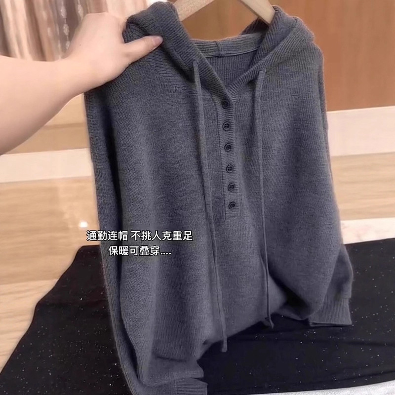 工厂直销灰色韩系时尚连帽纽扣长袖针织衫女秋冬新款显瘦宽松毛衣