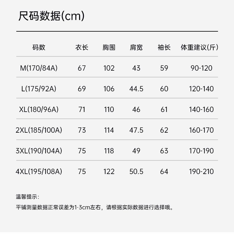 尺码 M 参考90-118斤左右,L 参考118-135斤左右,XL 参考135-150斤左右,2XL 参考150-165斤左右,3XL 参考165-185斤左右,4XL 参考185-210斤左右