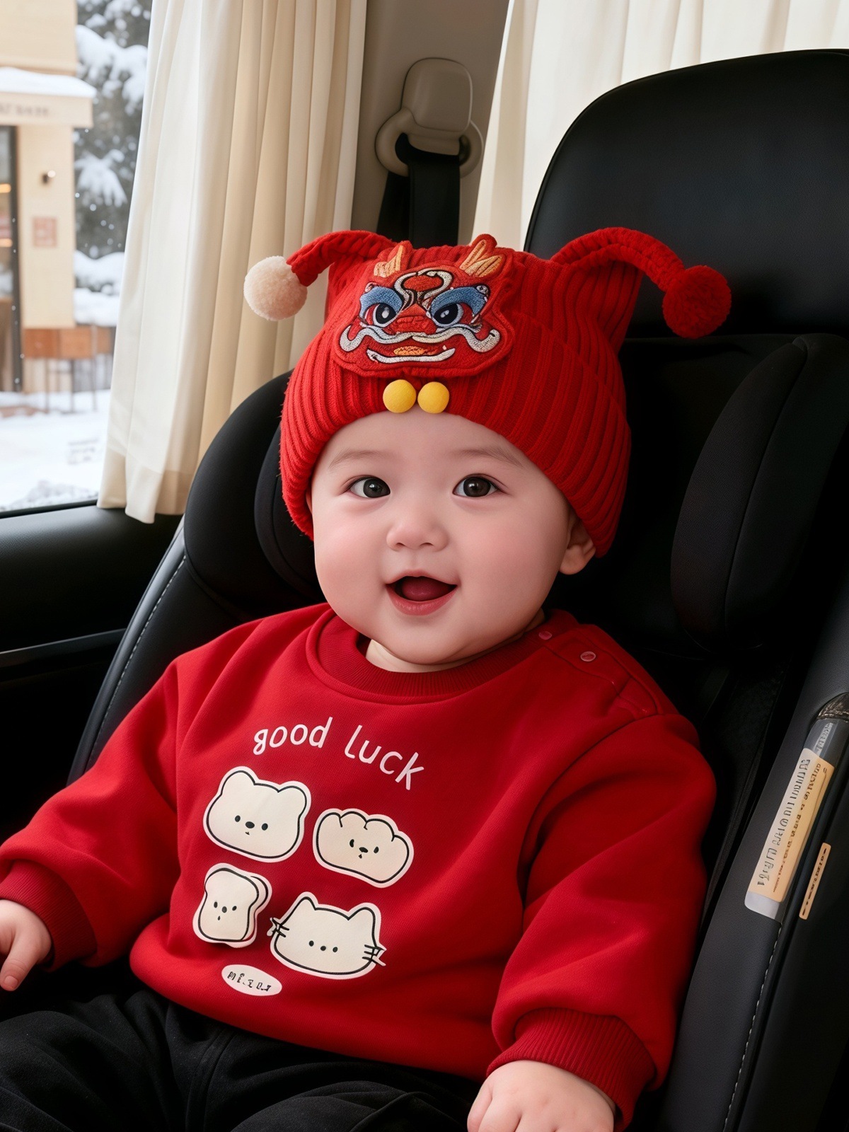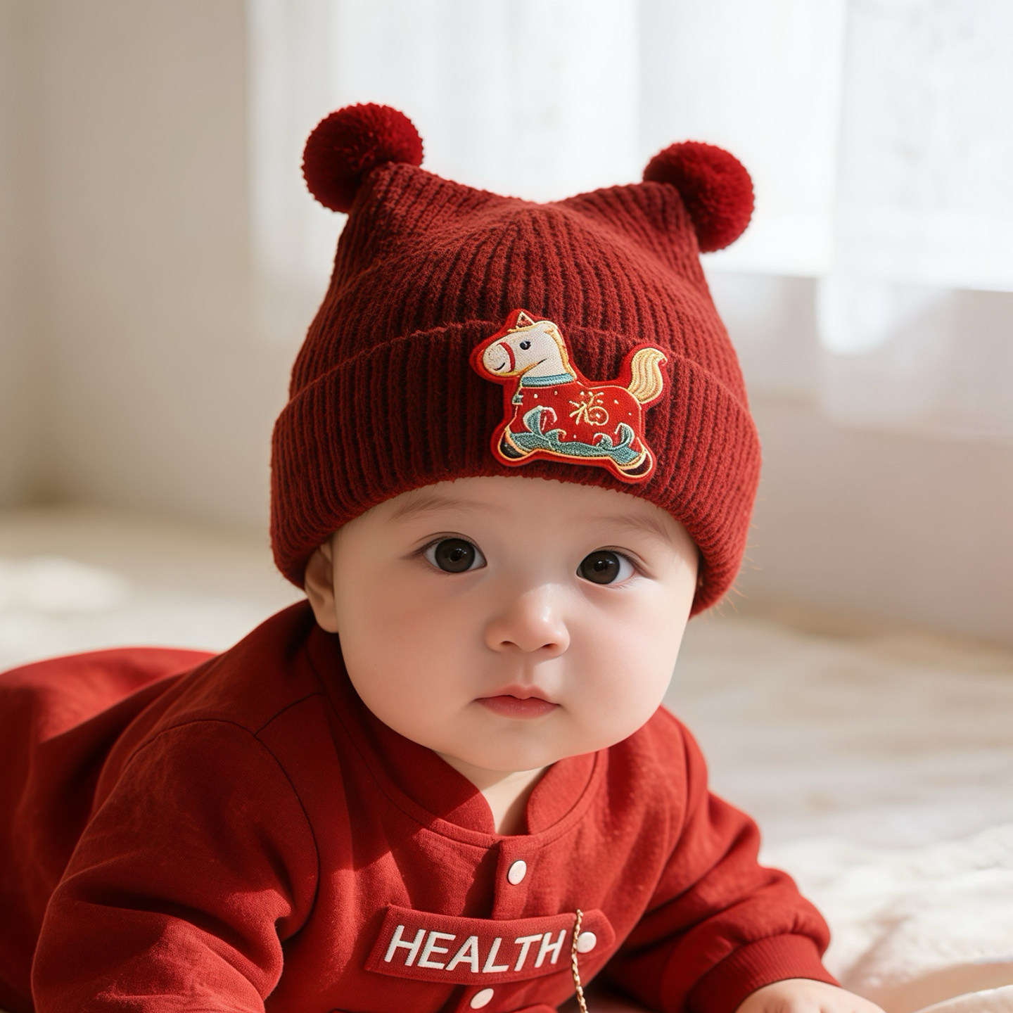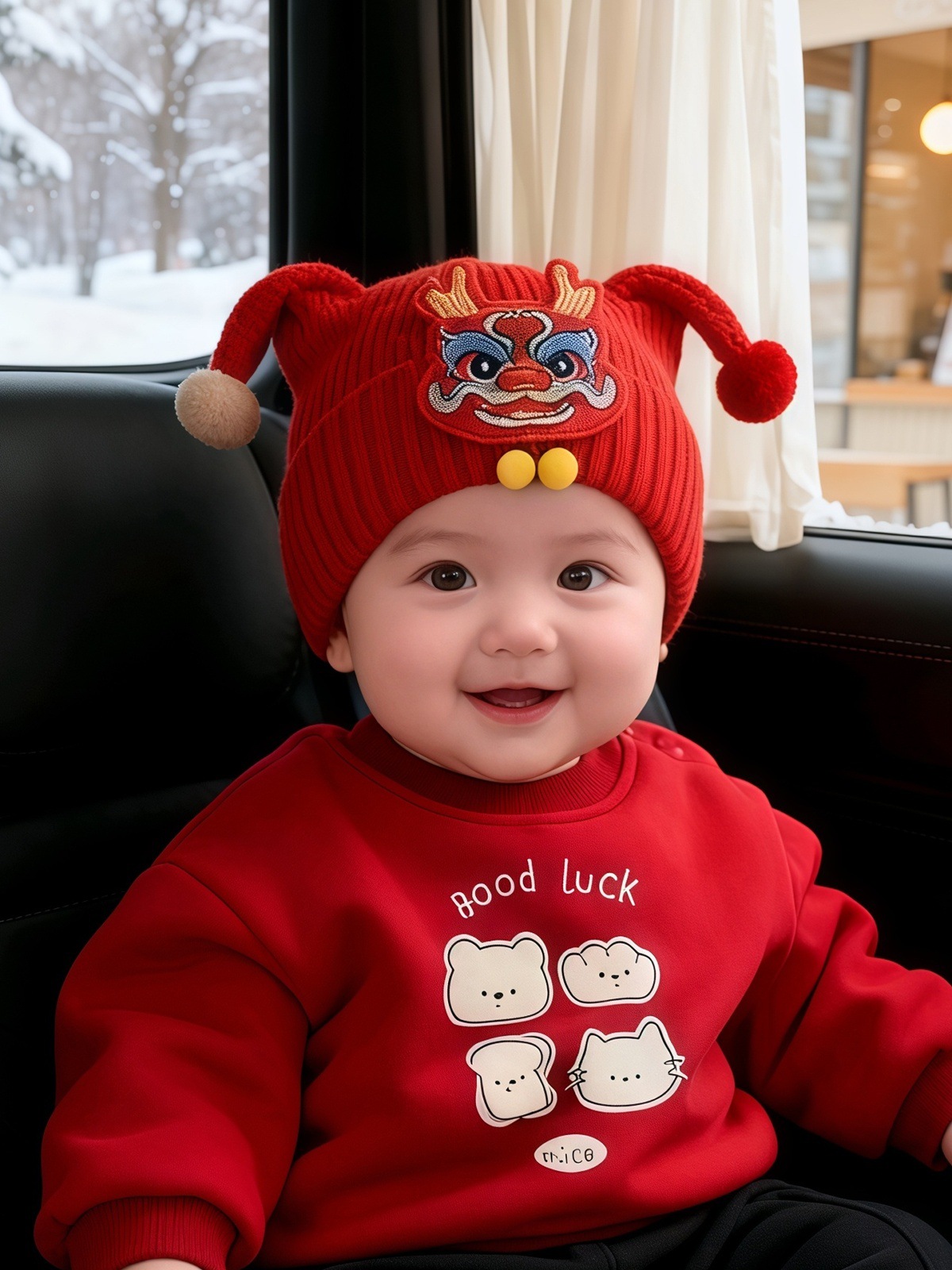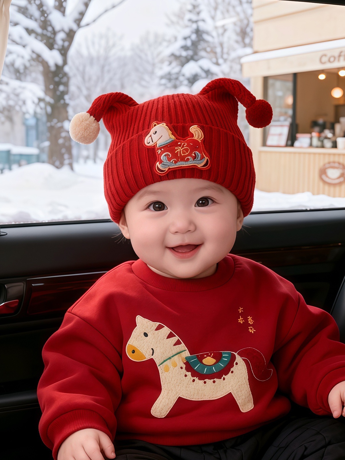 冬季儿童婴儿红色喜庆帽子新年保暖男宝宝女孩周岁护耳套头毛线帽