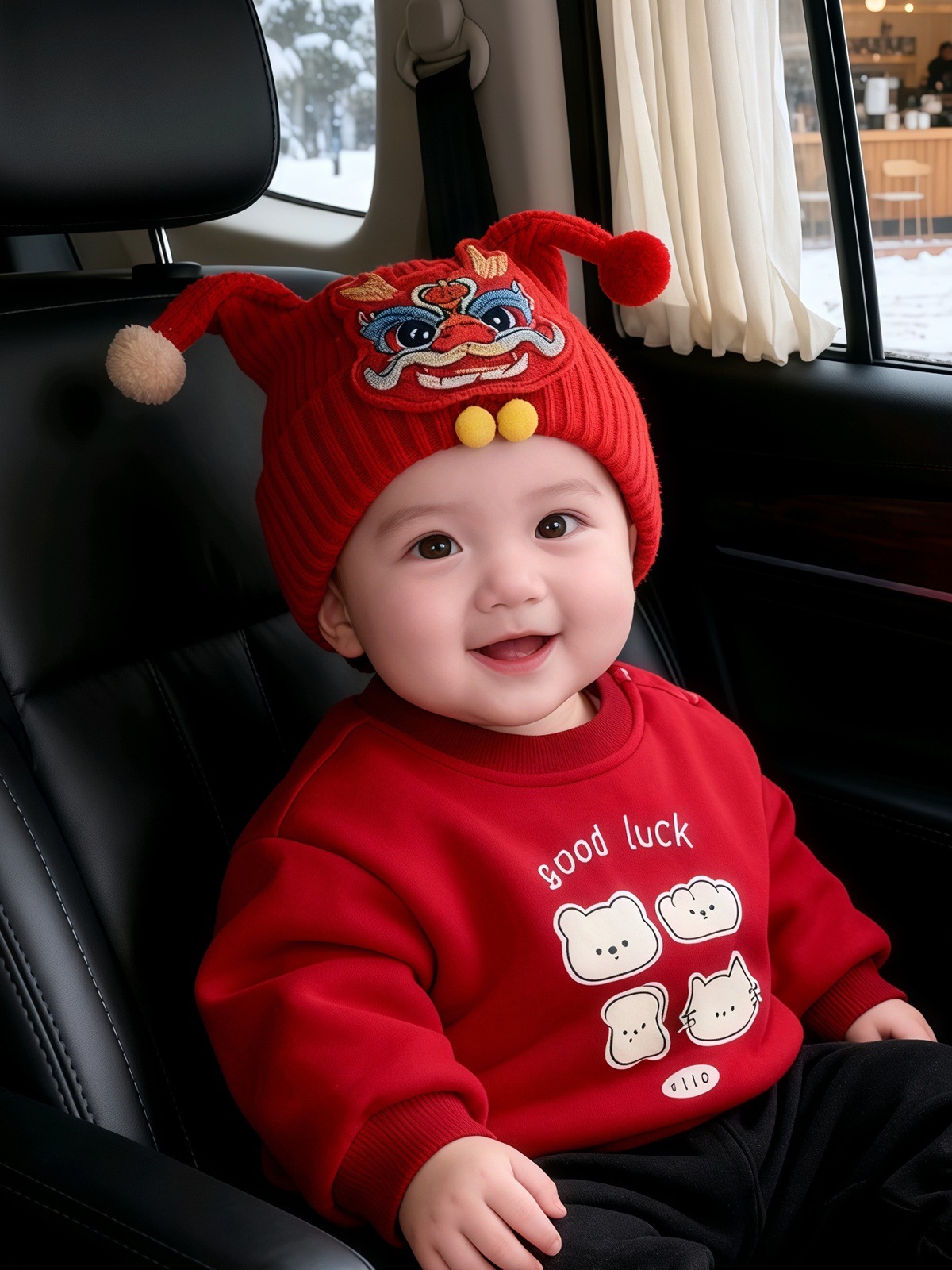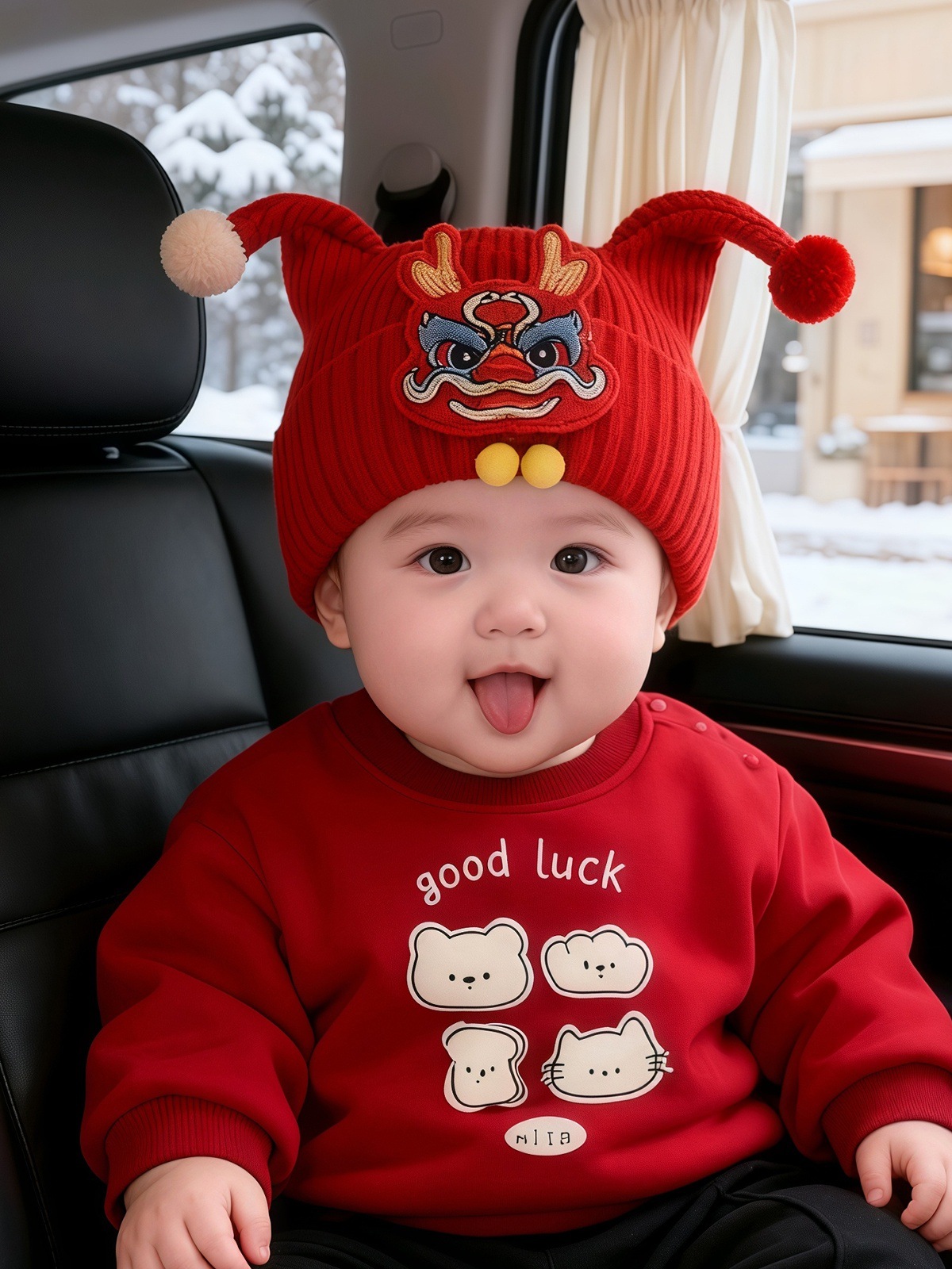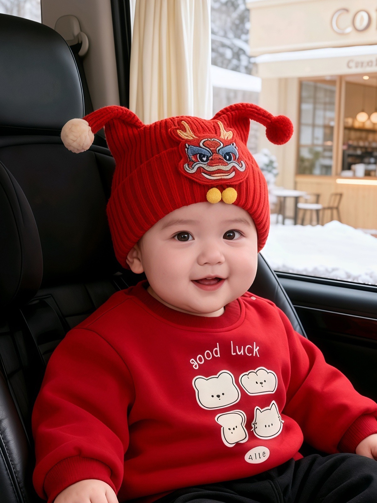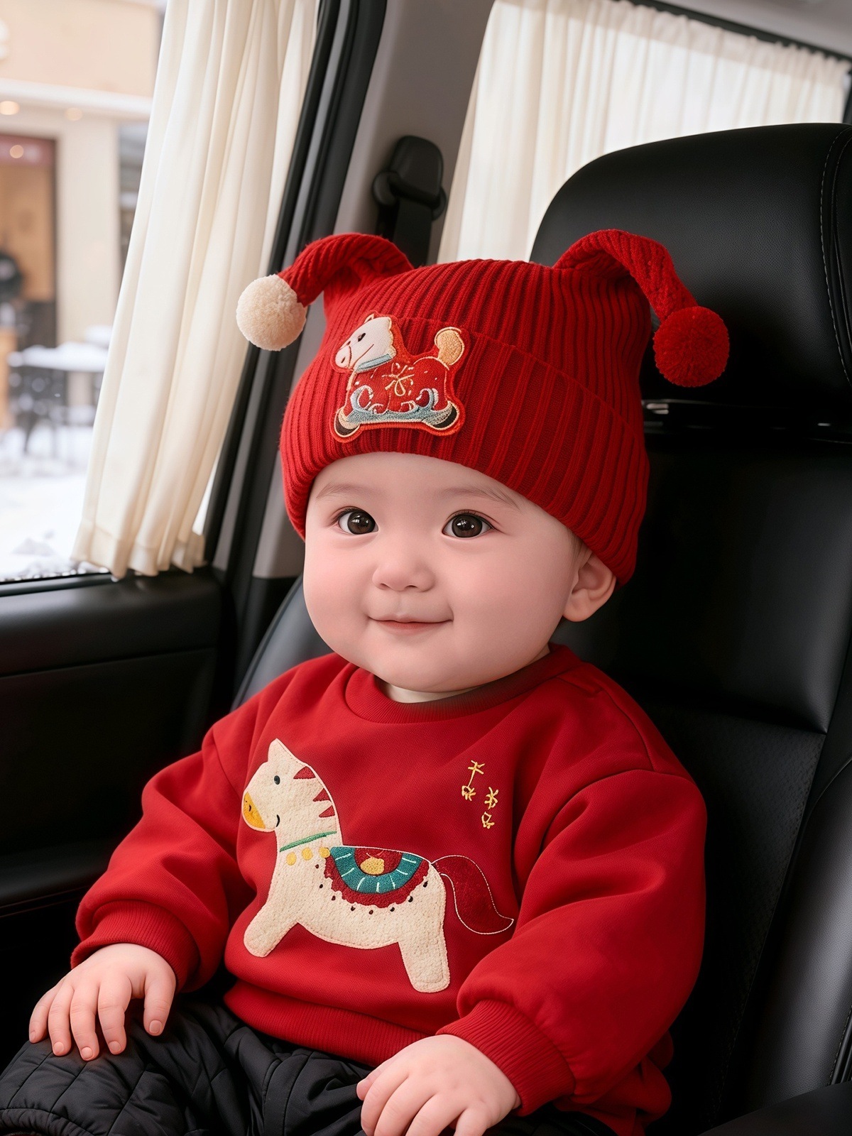 冬季儿童婴儿红色喜庆帽子新年保暖男宝宝女孩周岁护耳套头毛线帽