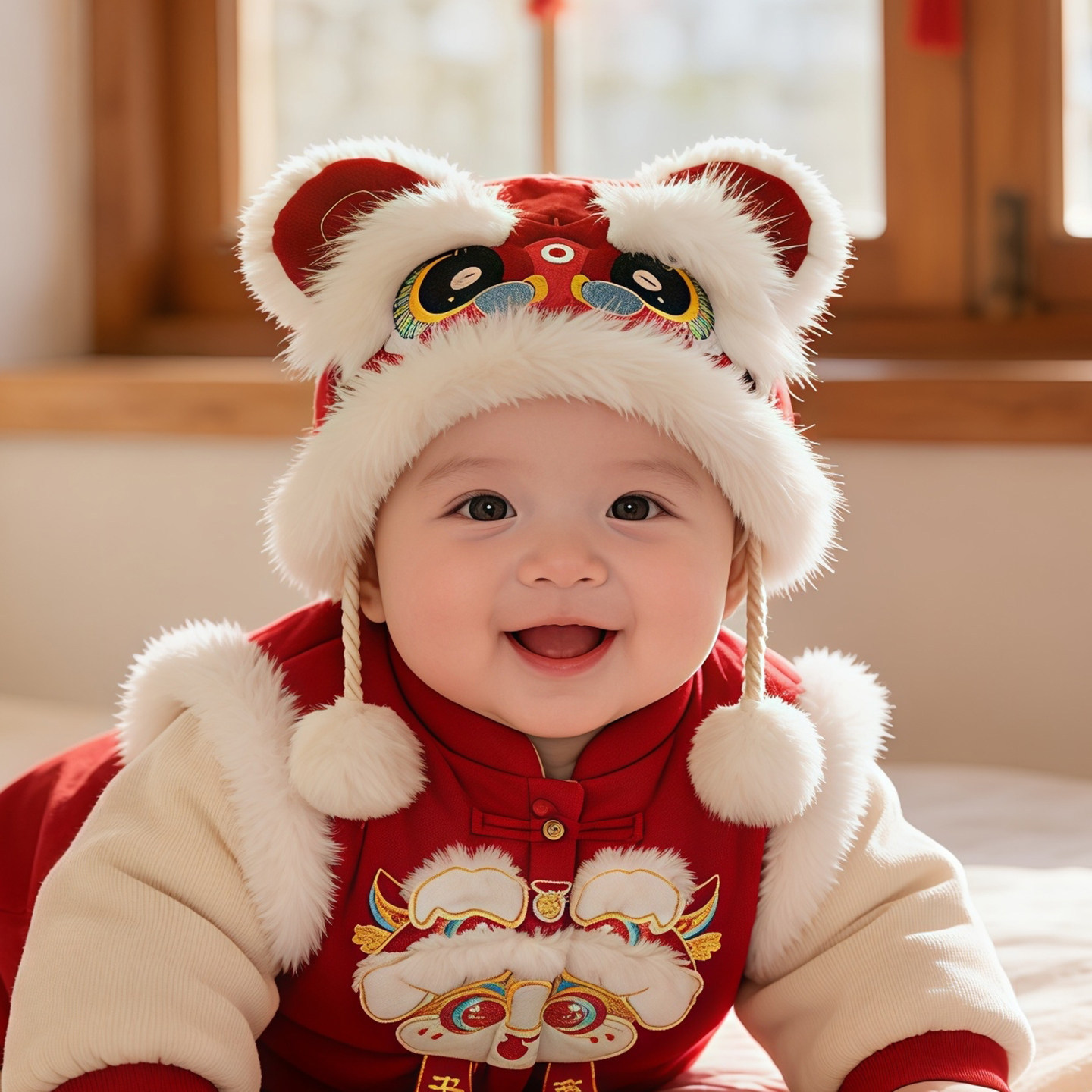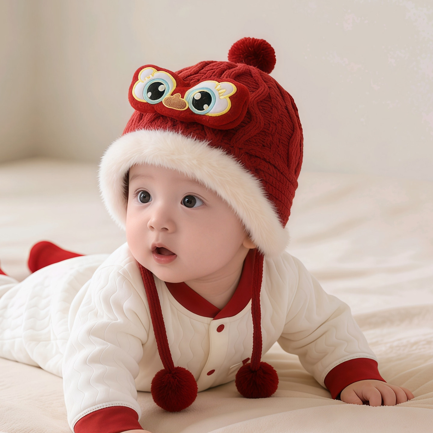 婴儿红色新年帽子冬季保暖加厚护耳毛线帽男女宝宝喜庆虎头毛绒帽