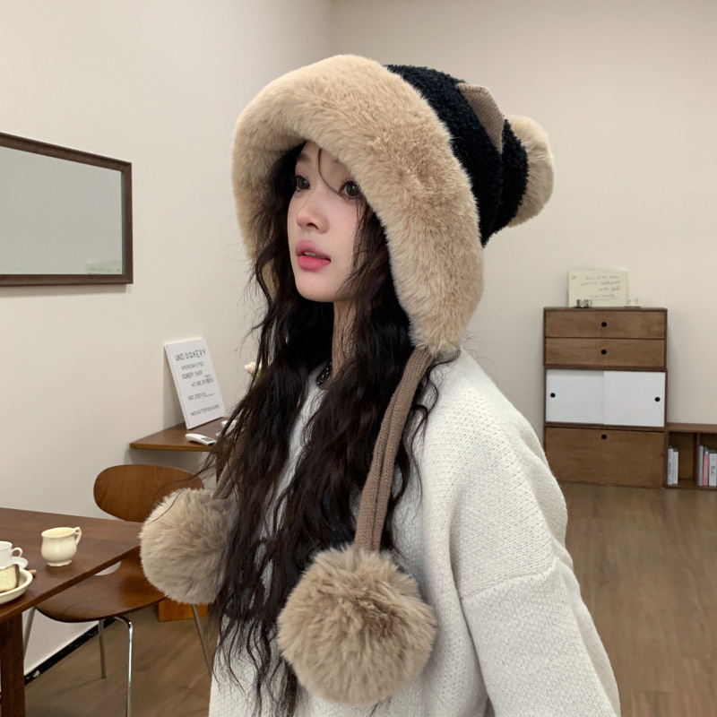 2025年新作 冬用 韓国風 多用途 可愛い耳付きぬいぐるみ帽子 レディース 裏起毛 耳当て付き レイフェン帽 女性用 防寒
