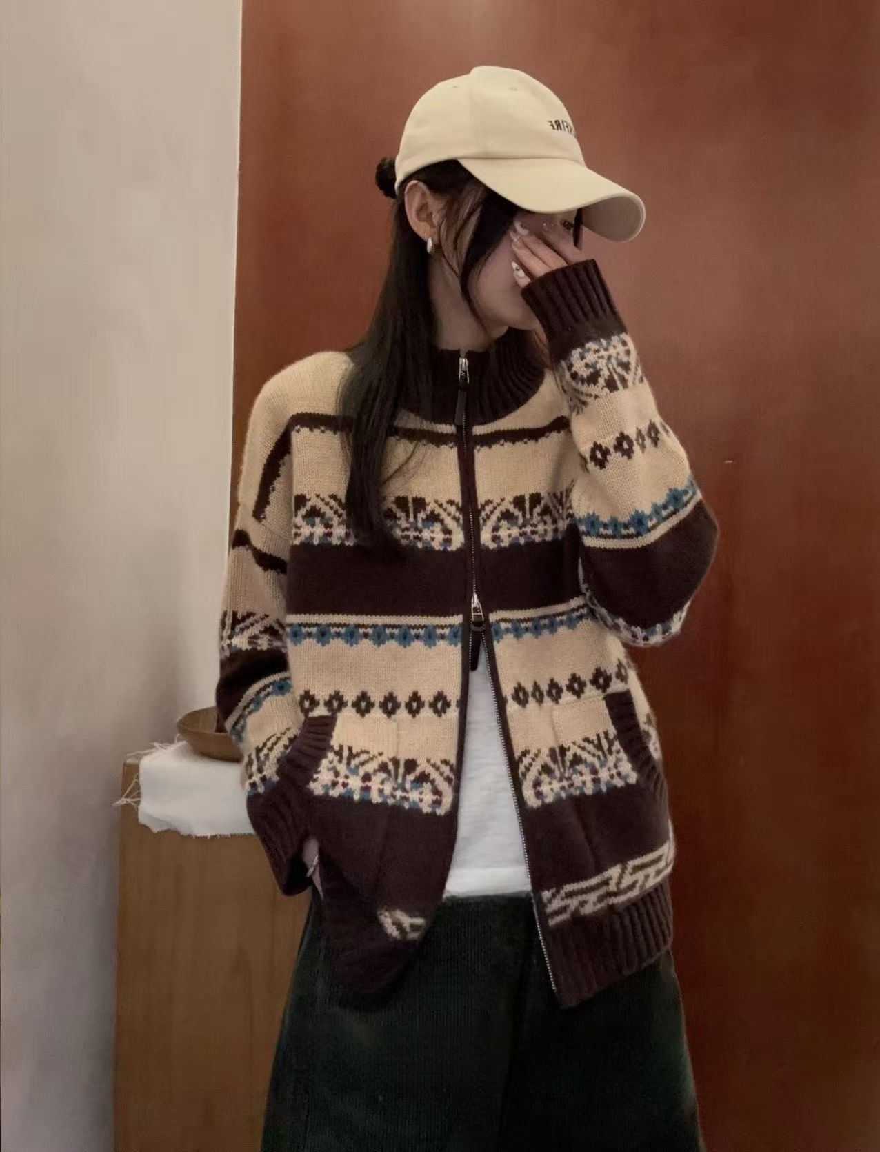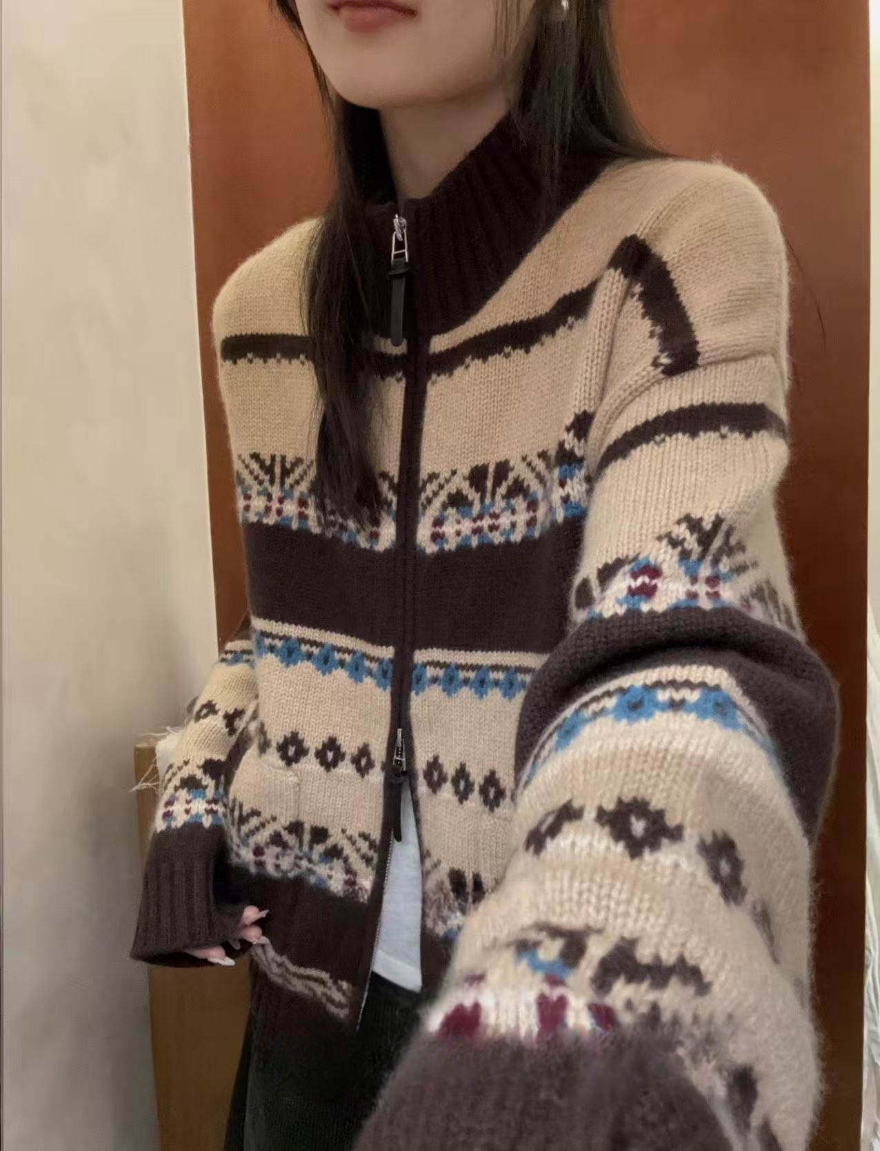 2025年秋冬新款百搭时尚扭花拉链外套纯毛慵懒风开衫