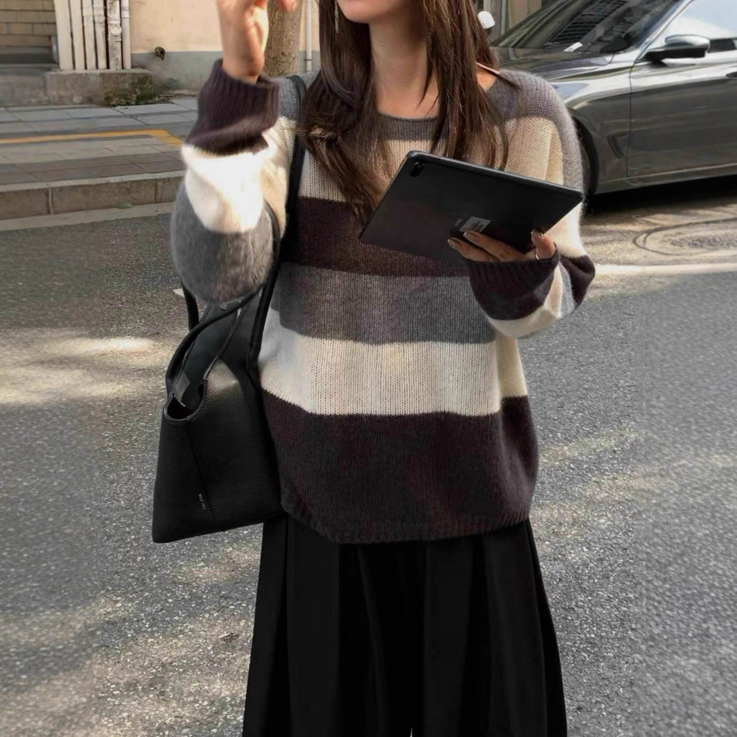 女式100纯羊毛衫圆领毛衣韩系氛围感慵懒风秋冬新款间色条纹内搭