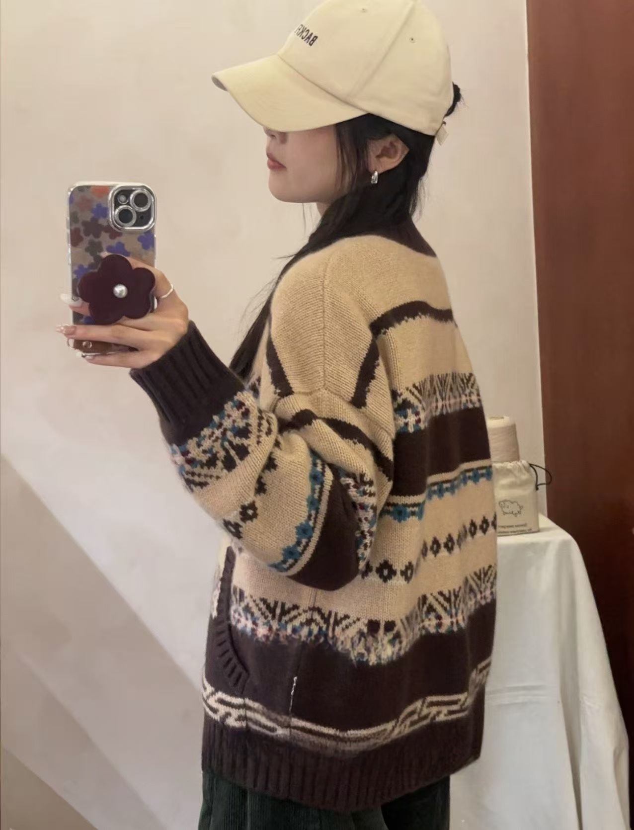 秋冬韩系氛围感宽松费尔岛针织毛衣纯羊毛开衫女休闲百搭上衣