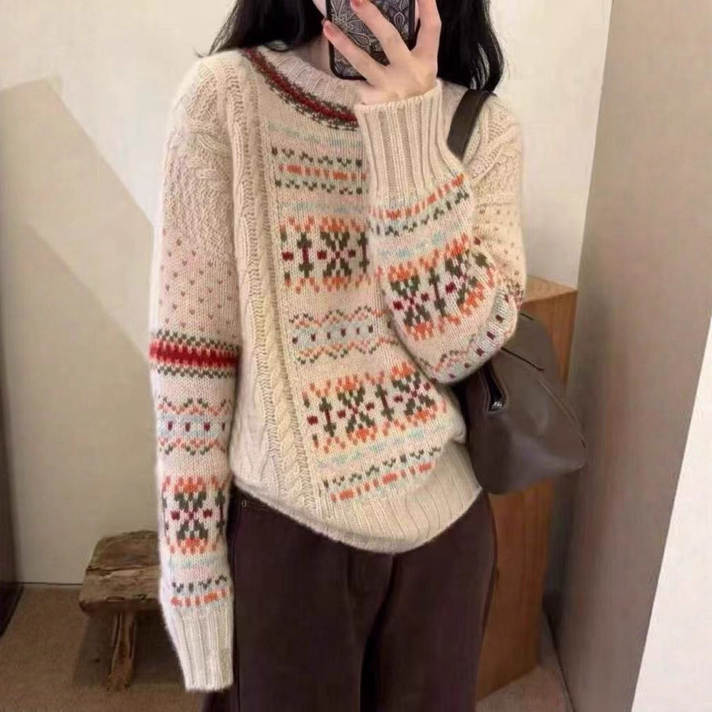 复古提花纯羊毛衫女士羊绒圆领加厚毛衣慵懒风针织打底衫