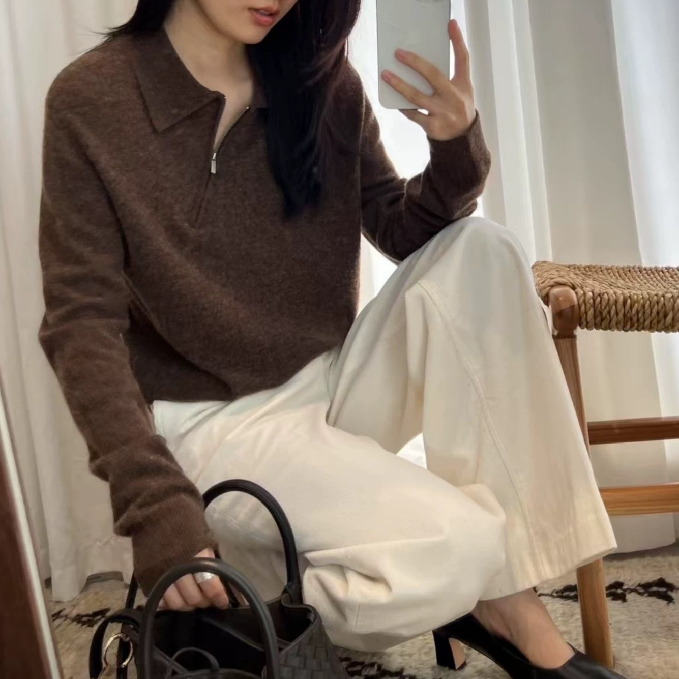 纯羊毛衫女式翻领斜门襟拉链毛衣秋冬新款个性潮流设计风格套头衫