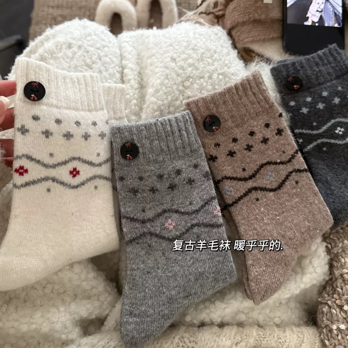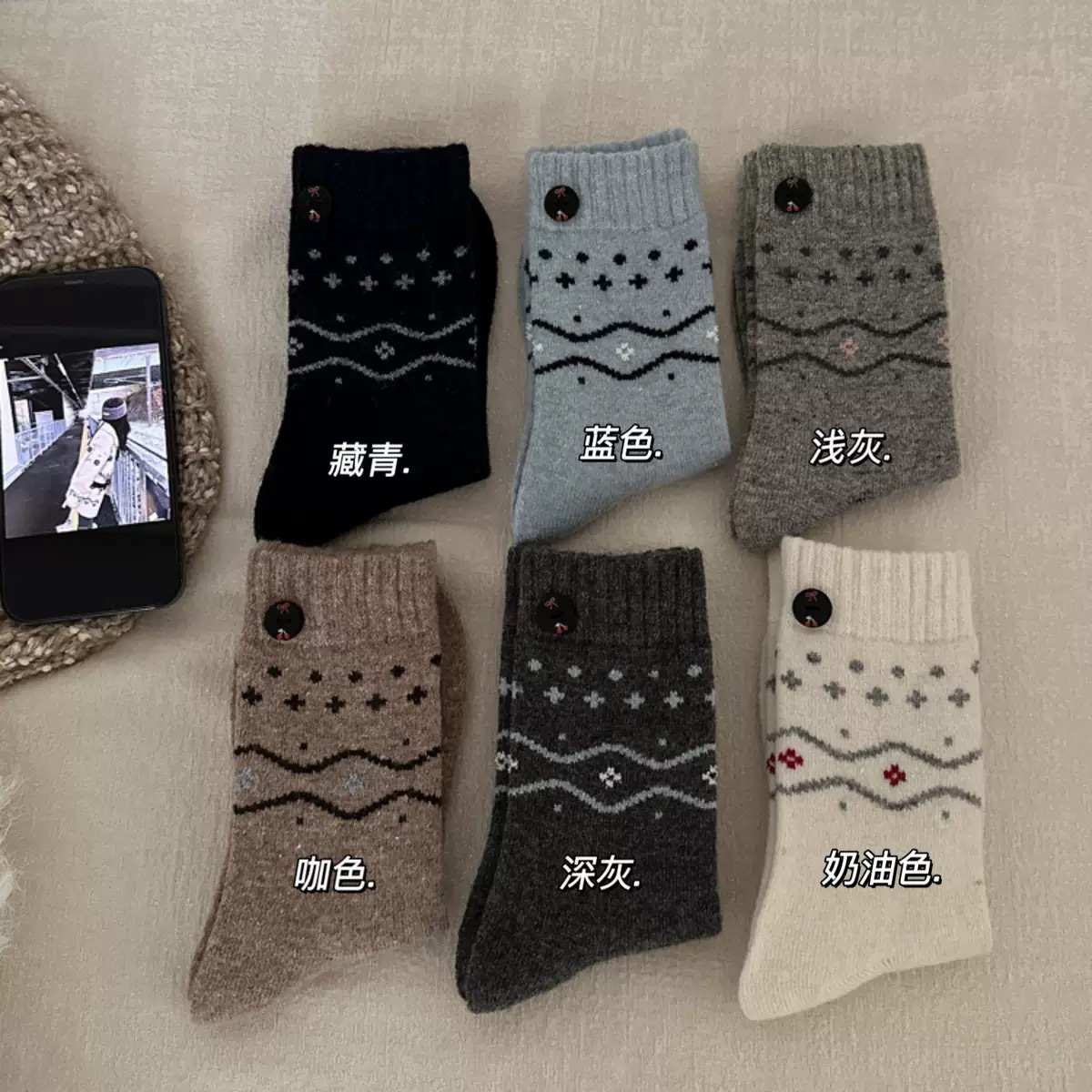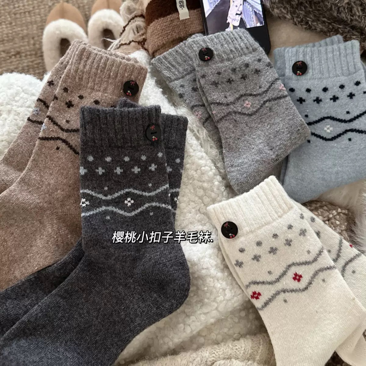羊毛袜子女秋冬复古无骨可爱樱桃扣子费尔岛保暖加厚中筒袜堆堆袜