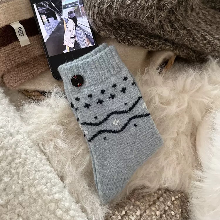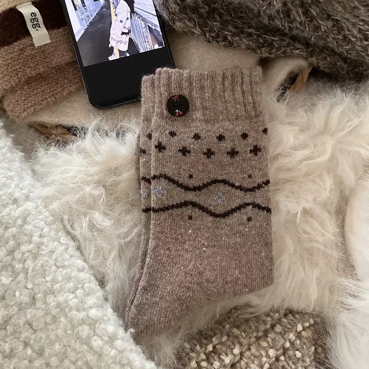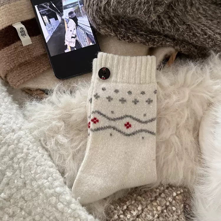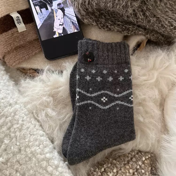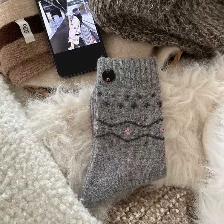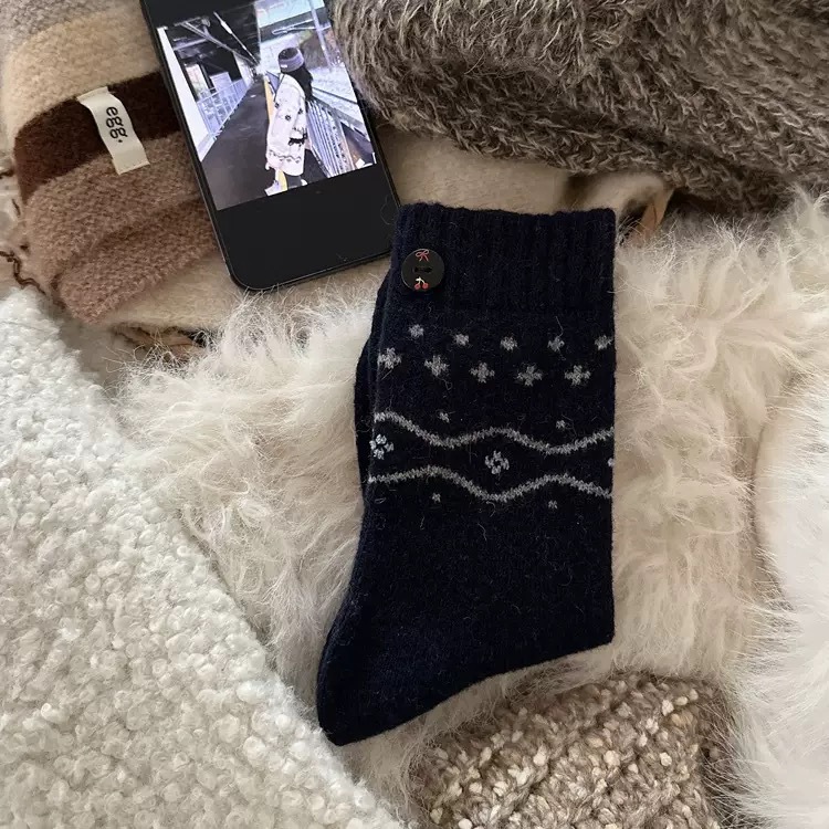 羊毛袜子女秋冬复古无骨可爱樱桃扣子费尔岛保暖加厚中筒袜堆堆袜