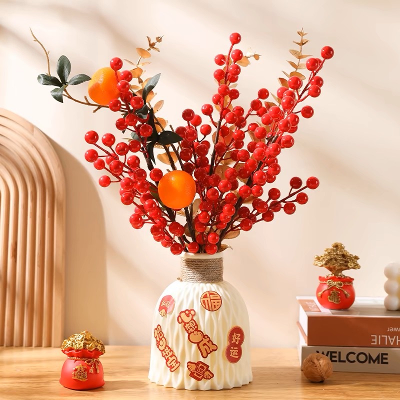 模造の赤い果物、縁起の良い幸運の果物、新年飾り、夜会花、リビングルームの赤い飾り、新年の飾り、冬青