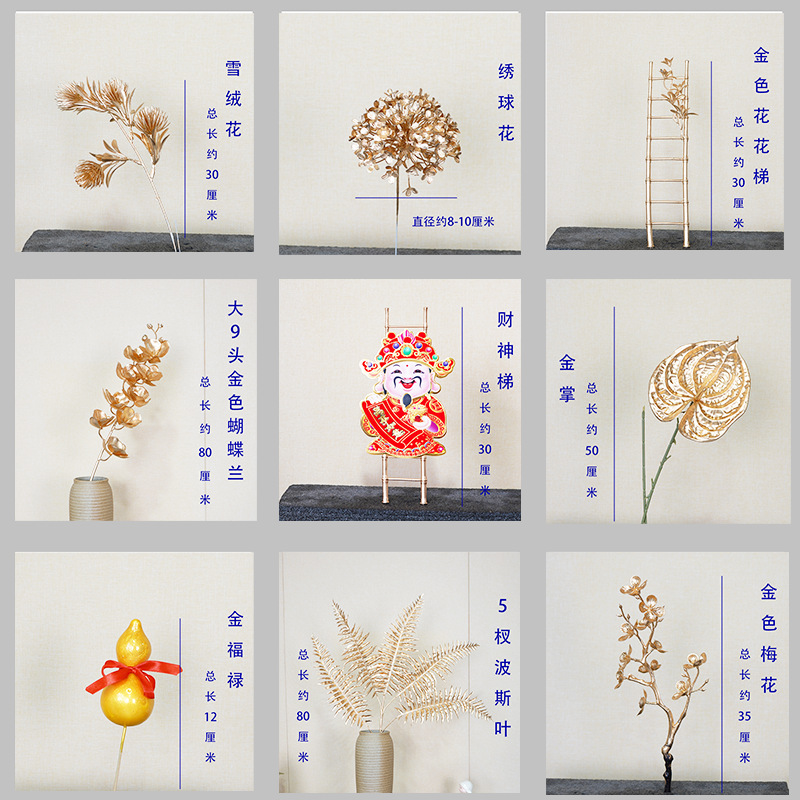 仿真金色花材单支扇福桶葵叶蝴蝶兰满天星金葫芦叶梅花尤加利绣球