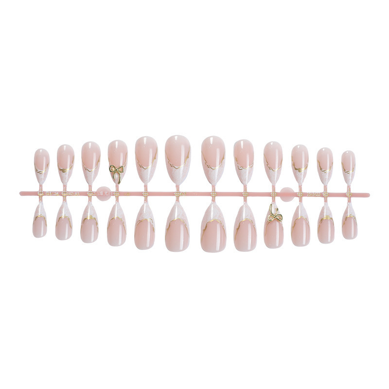 跨境穿戴甲温柔法式裸粉大理石纹金色蝴蝶结杏仁型女士假指甲批发