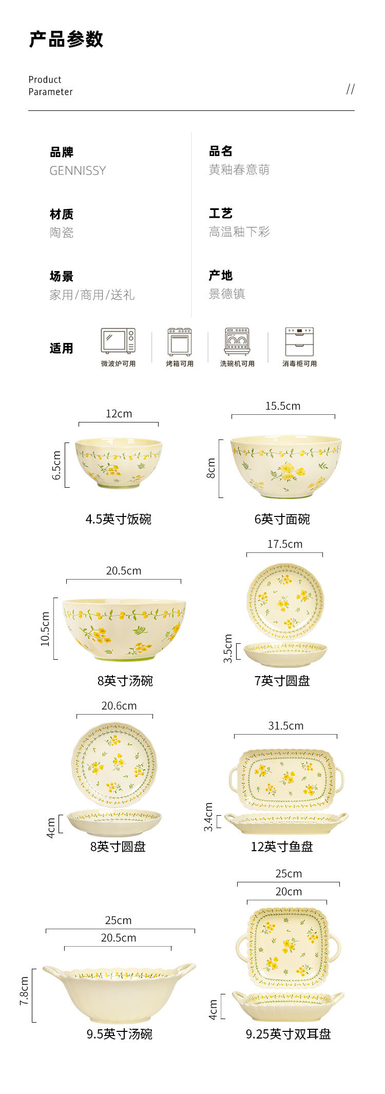 颜色 黄釉春意-4.5英寸饭碗,黄釉春意-6英寸面碗,黄釉春意-7英寸盘,黄釉春意-8英寸盘,黄釉春意-8寸英汤碗,黄釉春意-9寸英双耳汤碗,黄釉春意-12英寸鱼盘,黄釉春意-2人食8件套
