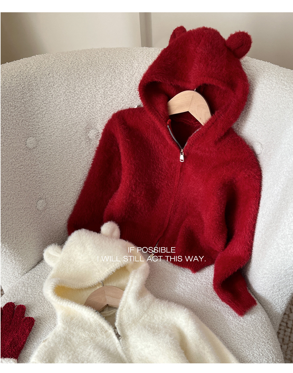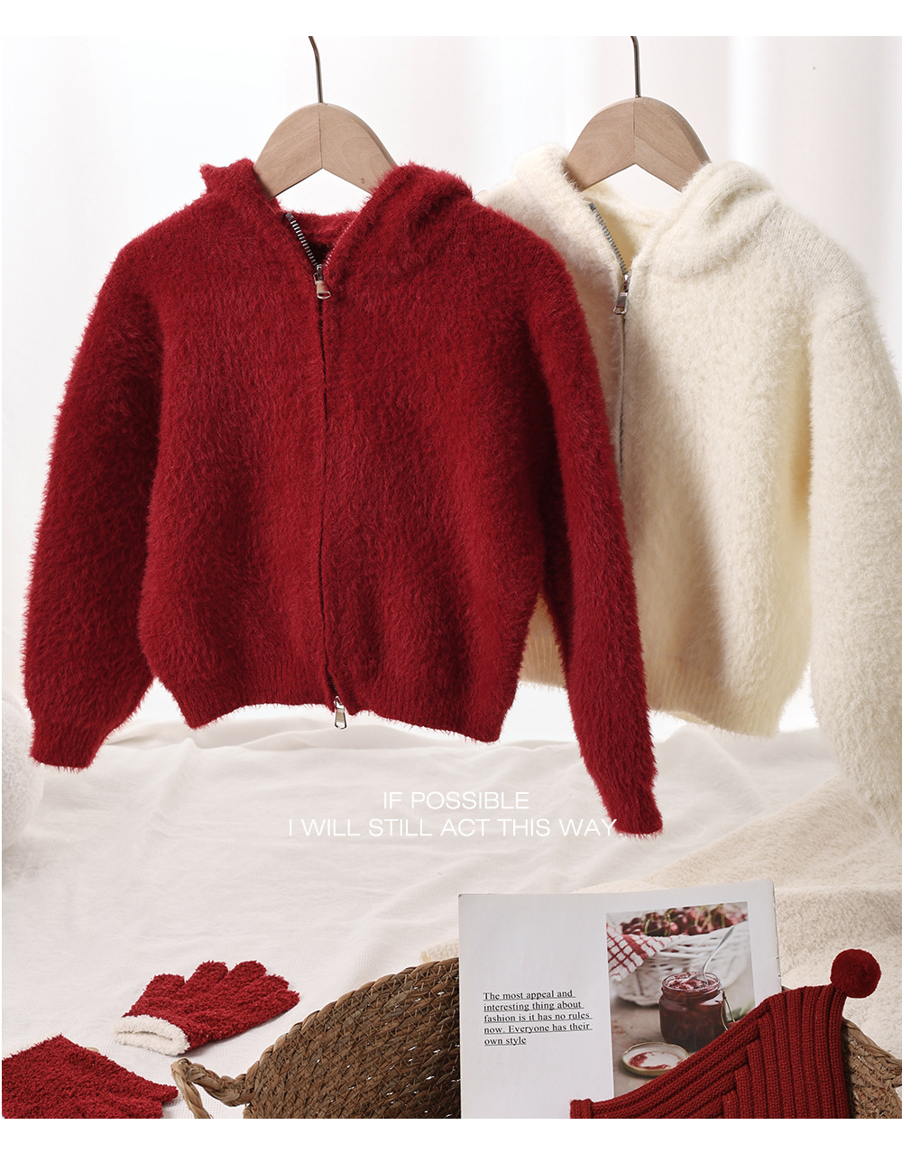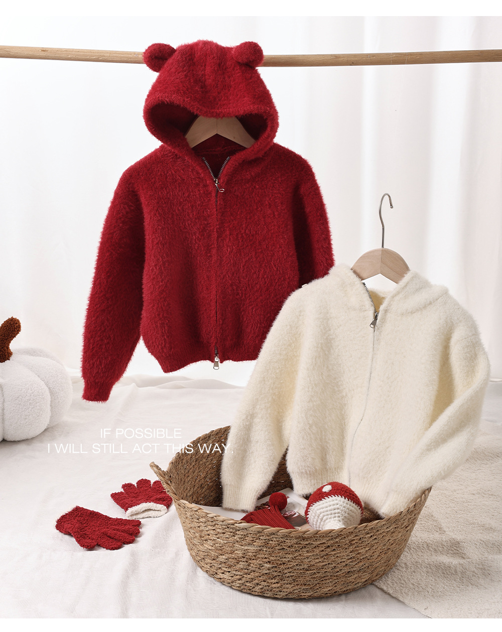 女童水貂绒毛衣开衫2025冬季新款连帽立体耳朵修身洋气短款外套潮