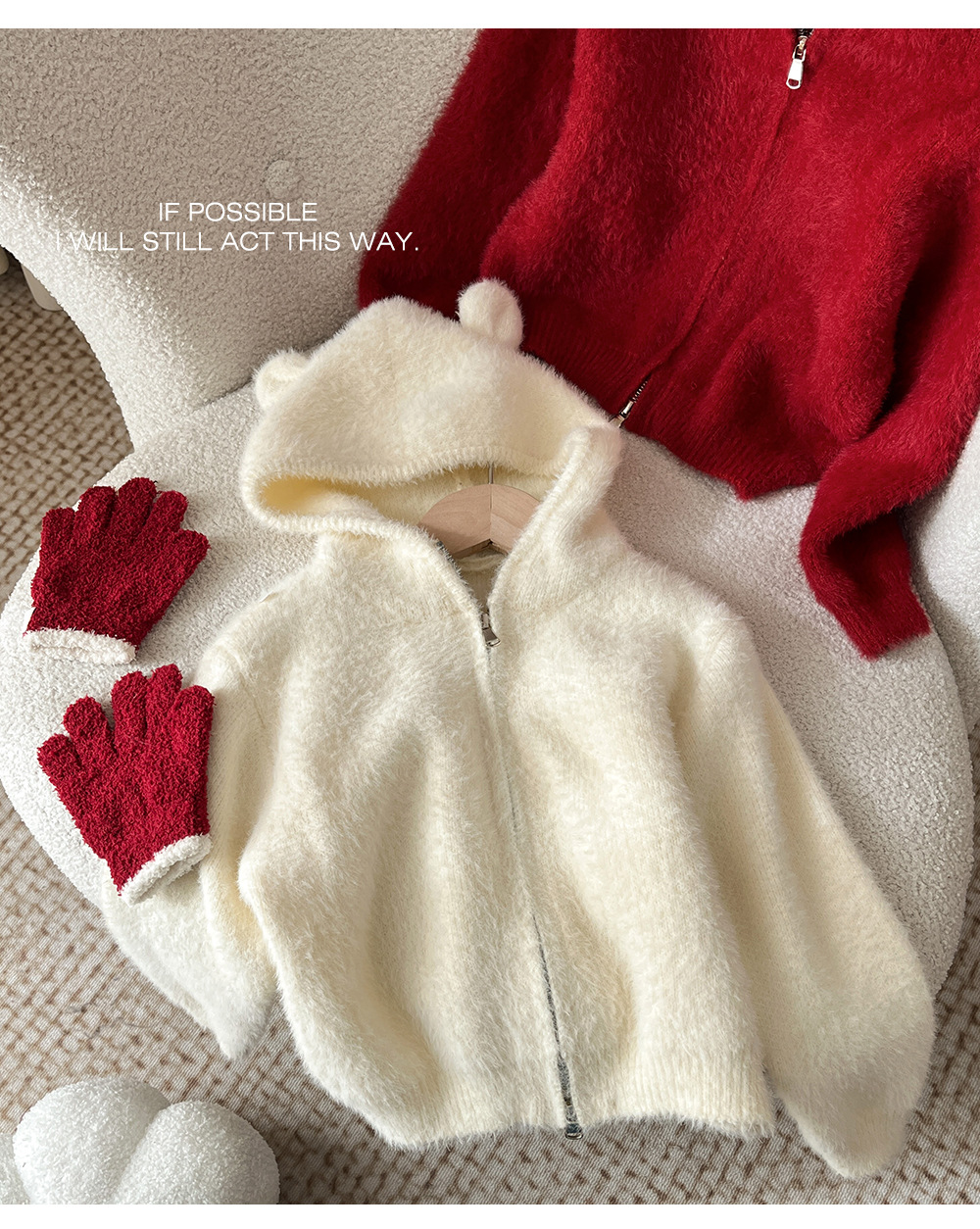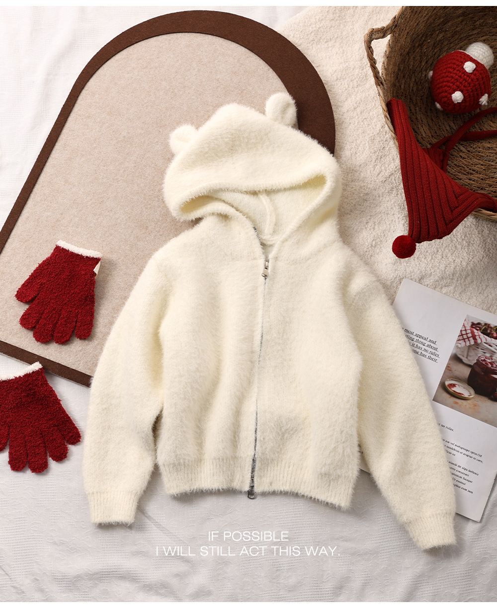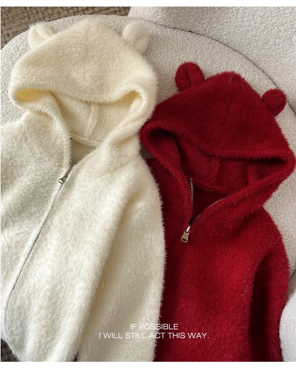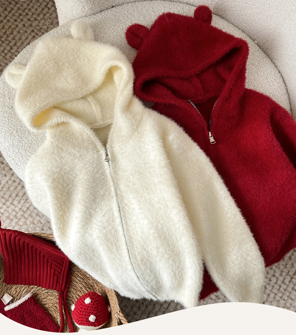 女童水貂绒毛衣开衫2025冬季新款连帽立体耳朵修身洋气短款外套潮