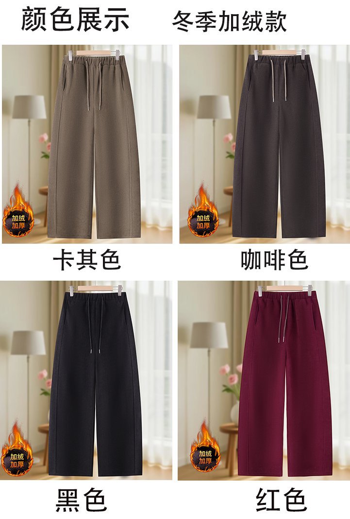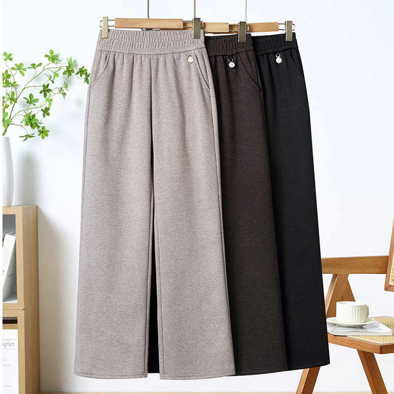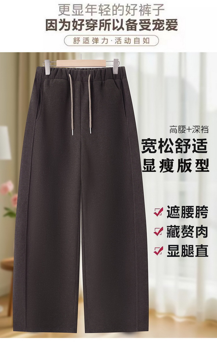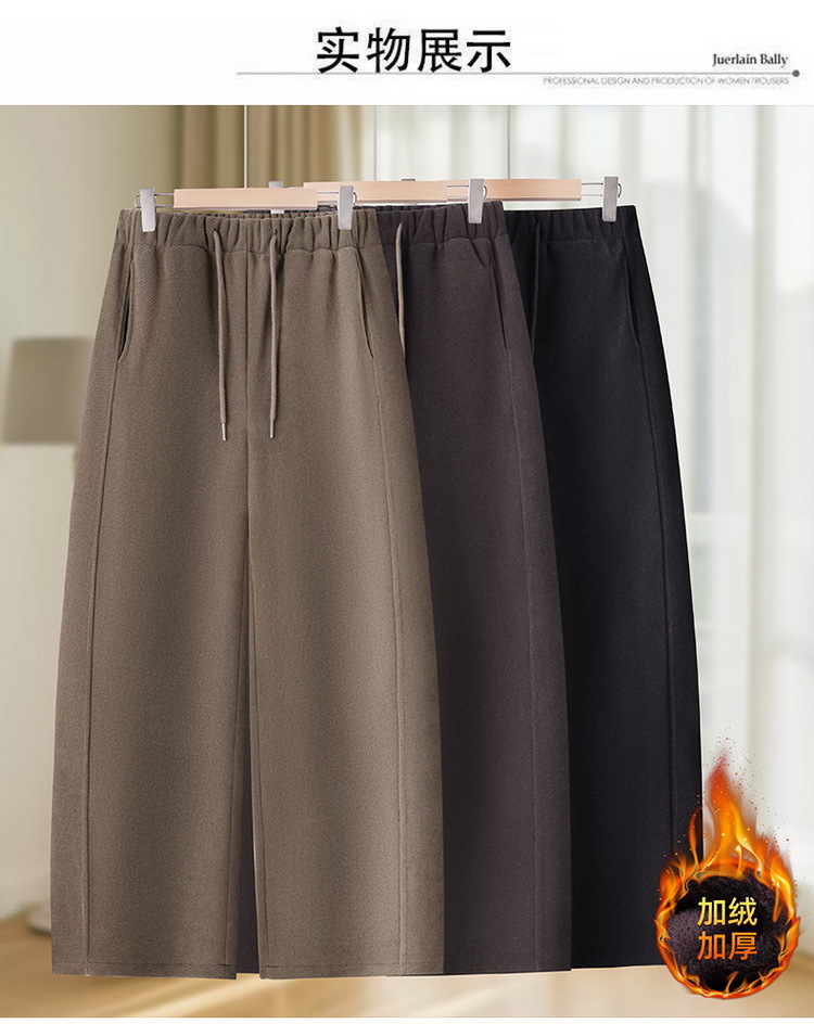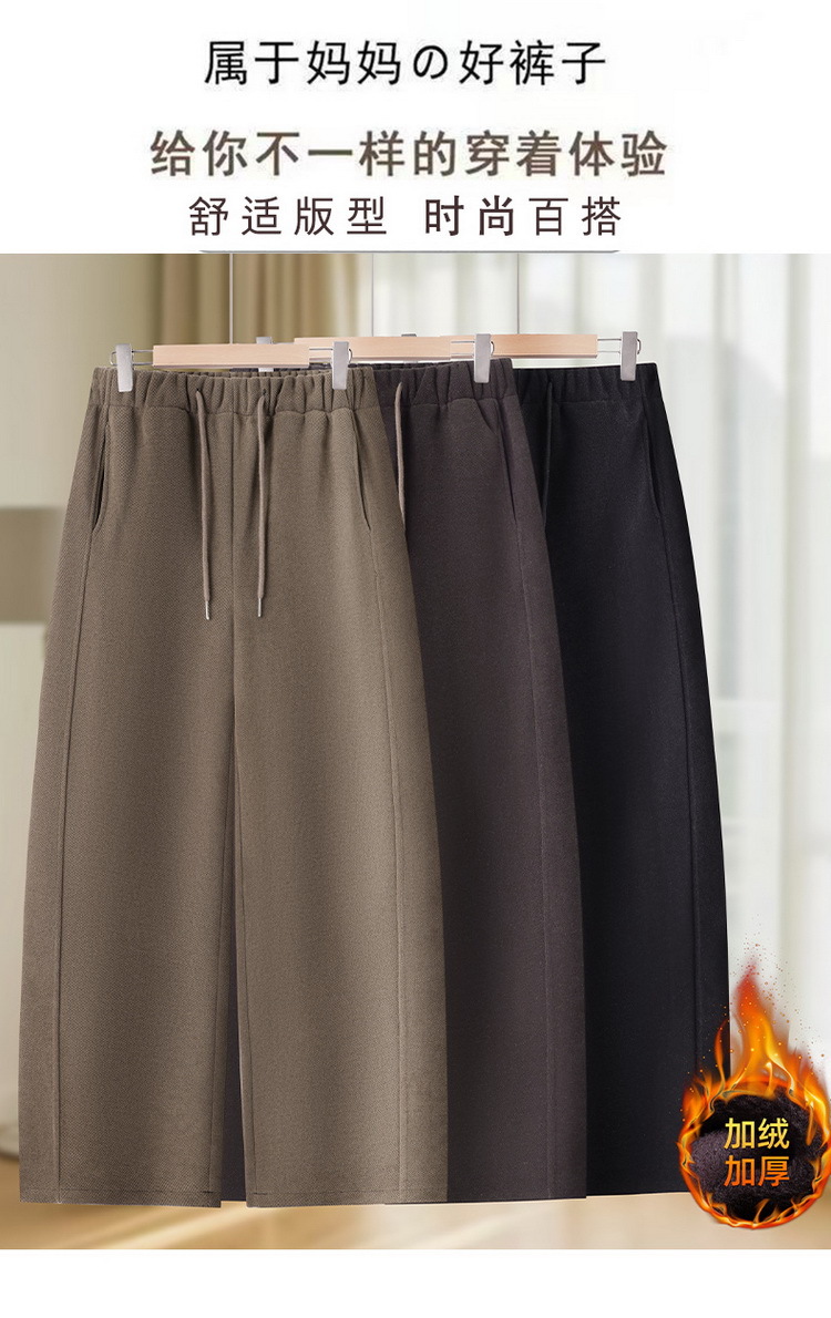 妈妈秋冬装毛呢直筒阔腿裤中老年女士松紧腰加绒加厚大码长裤