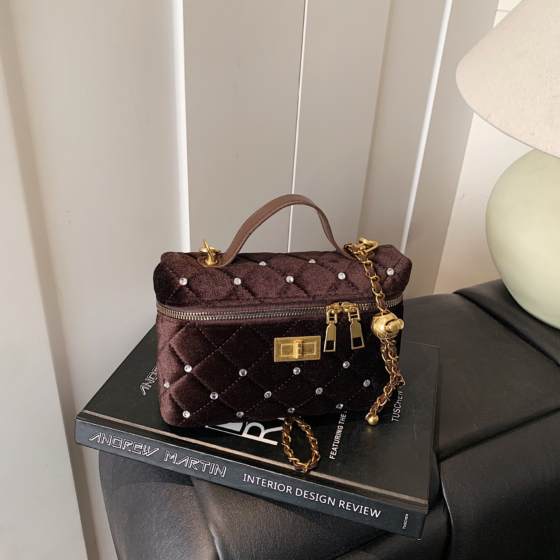小香风丝绒菱格镶钻盒子包链条满天星手提挎包洋气轻奢高级单肩包