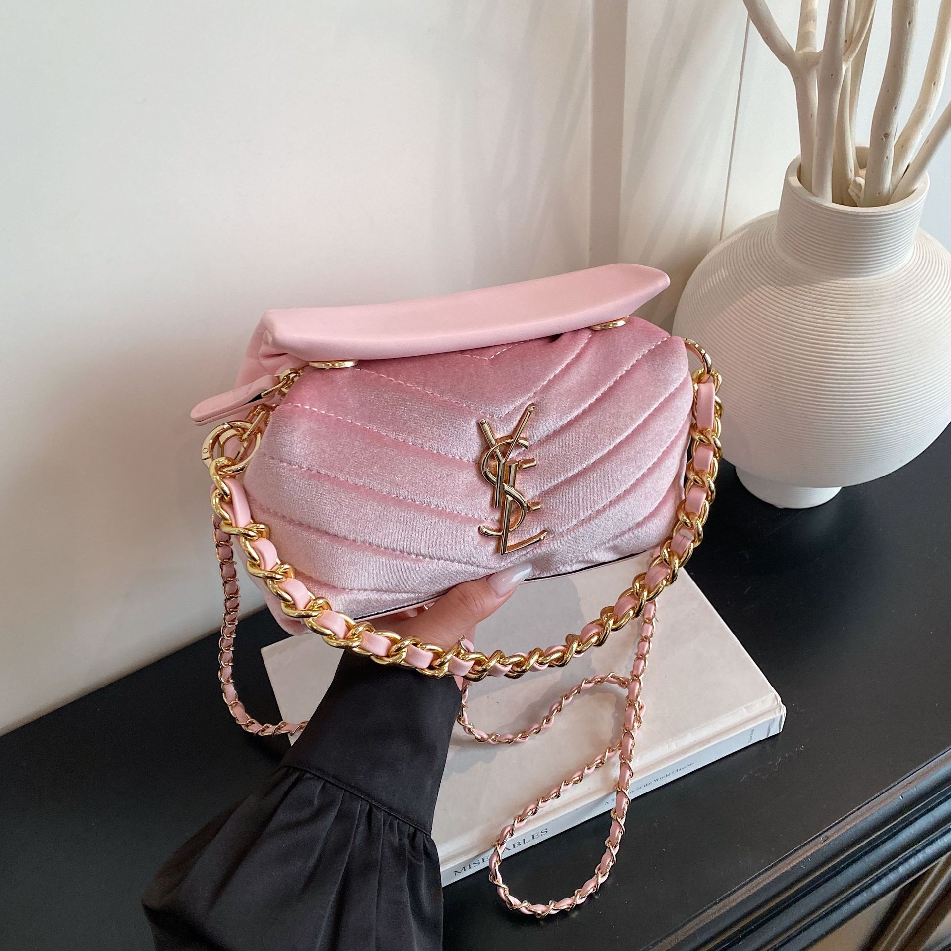 高级质感链条小方包bags小香风轻奢丝绒菱格潮时尚气质单肩斜挎包