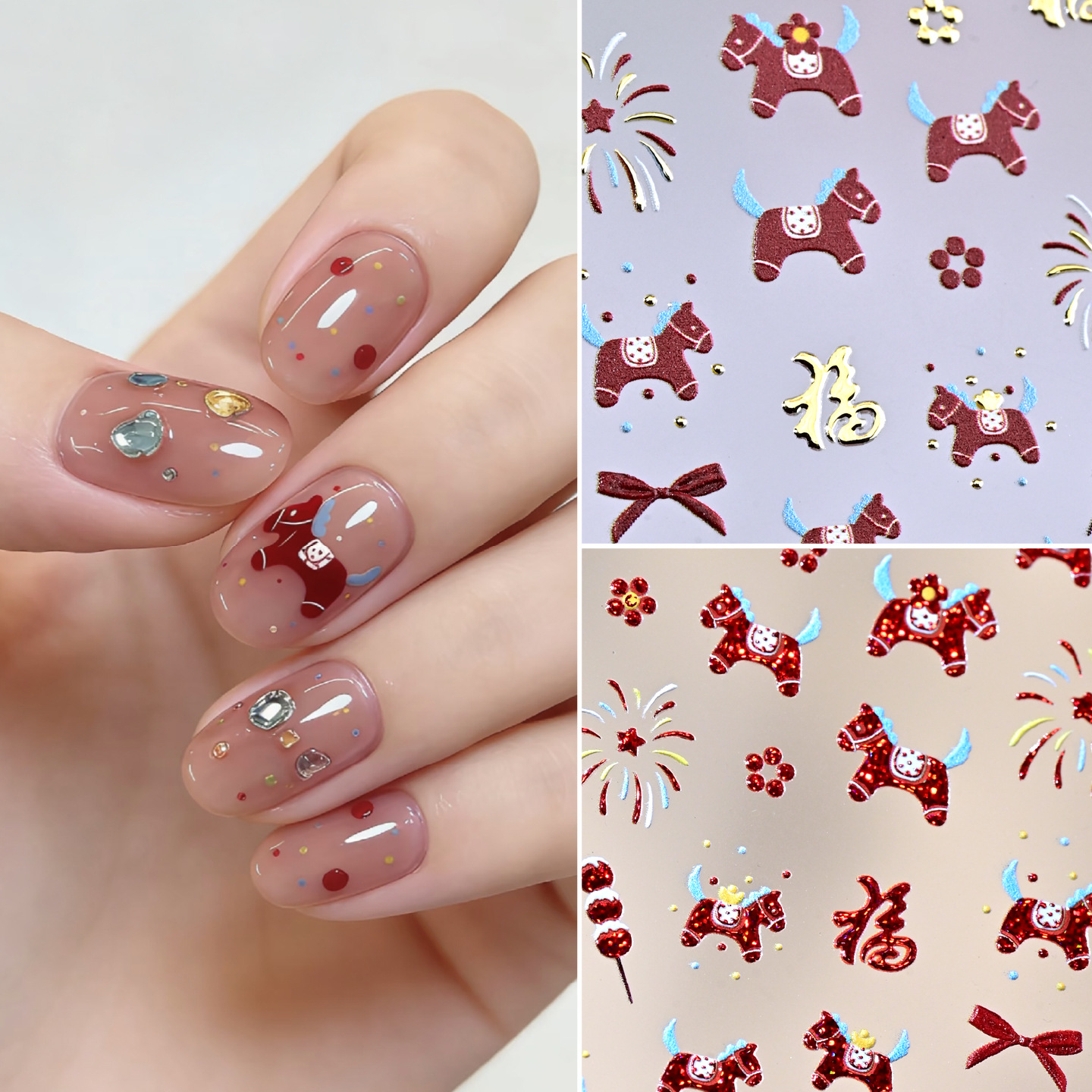 美甲贴纸爆款烫金立体可爱小马新年好运烟火蝴蝶结指甲贴纸配饰