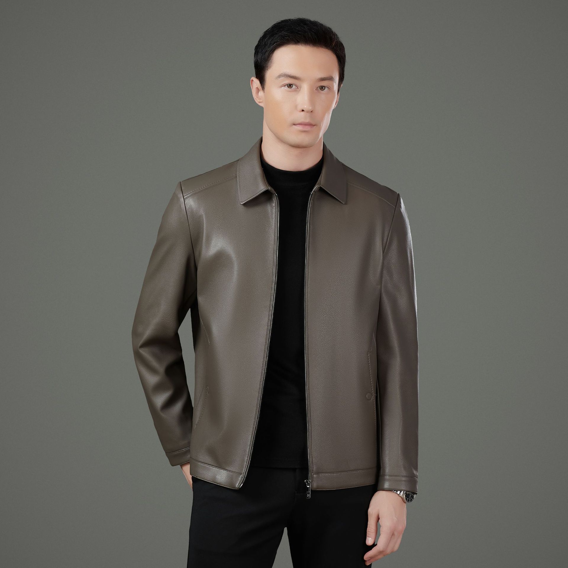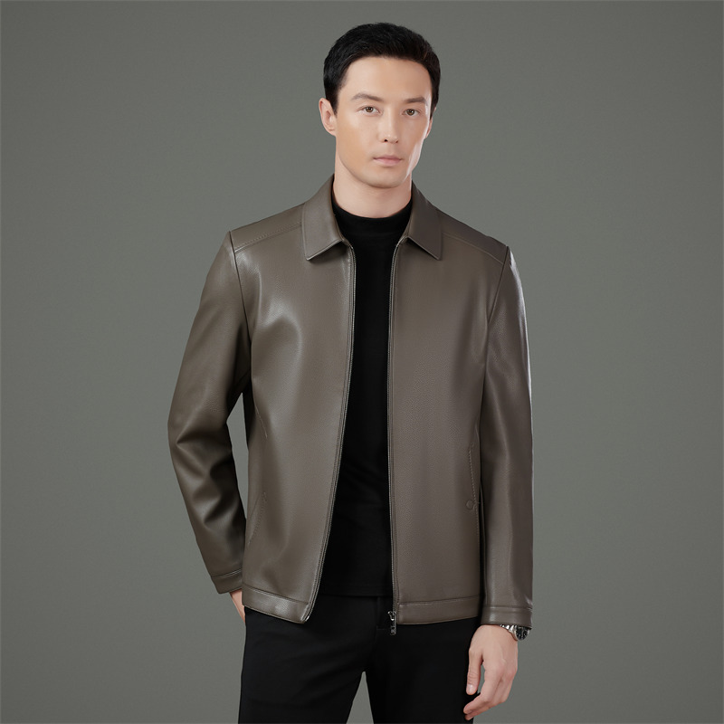 2025年海寧製メンズ中年向け羊革カジュアルビジネスジャケット、お父さん向け襟付き秋冬高級レザージャケット