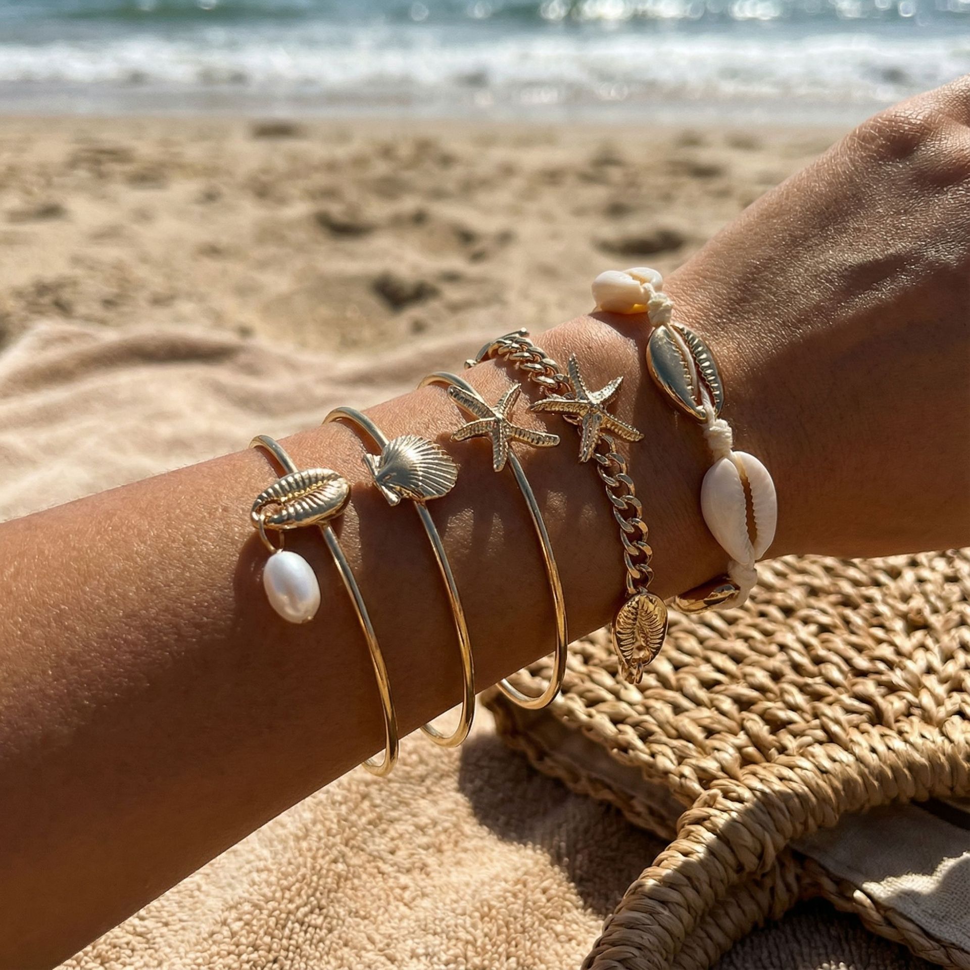 国境を越えた新型ボヘミアンリゾート風貝殻ブレスレットビーチ風海星真珠重ね手飾り5点セット