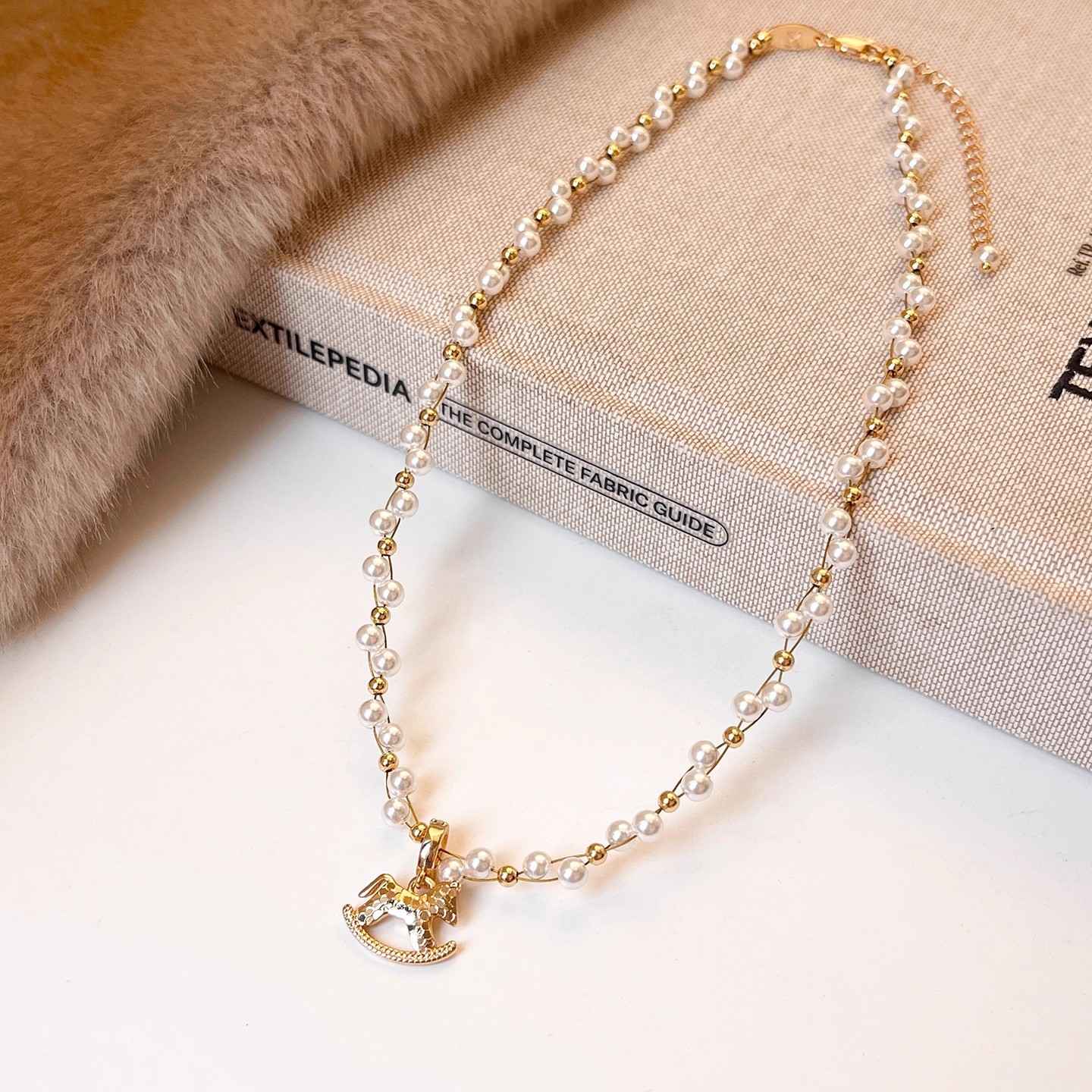 法式金色碎冰冰小马吊坠珍珠缠绕项链女轻奢精致高级感毛衣链配饰