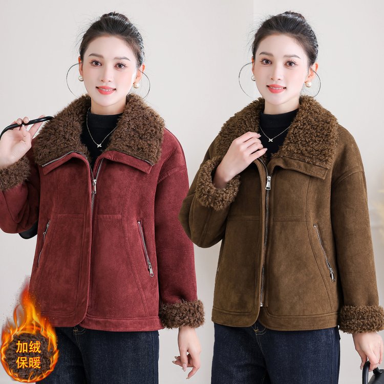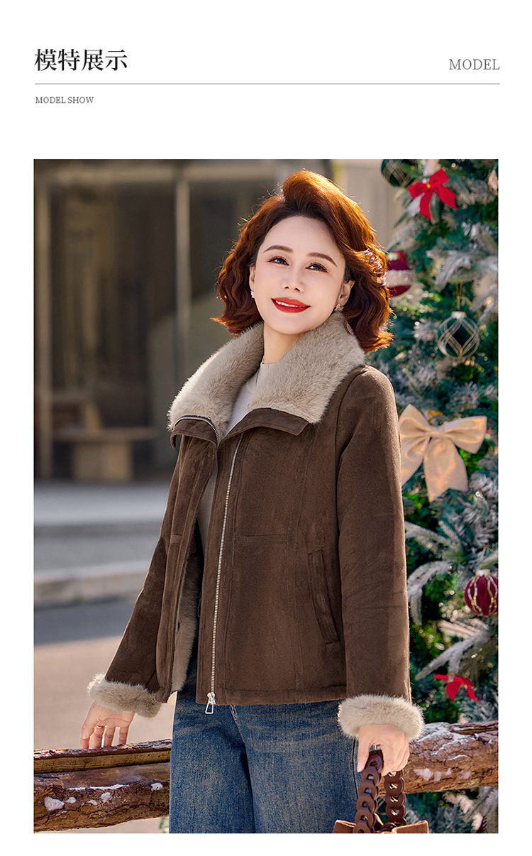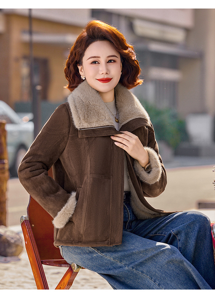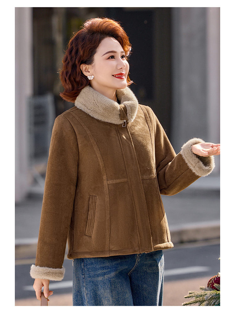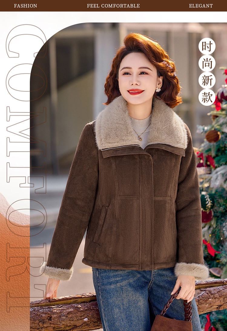妈妈装秋冬加绒加厚外套中老年保暖短款夹克翻领毛绒拼接宽松上衣