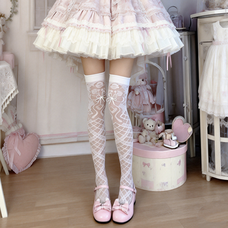 心萌少女「菱缠花结」原创Lolita长筒丝袜女薄款甜美黑白色高筒袜