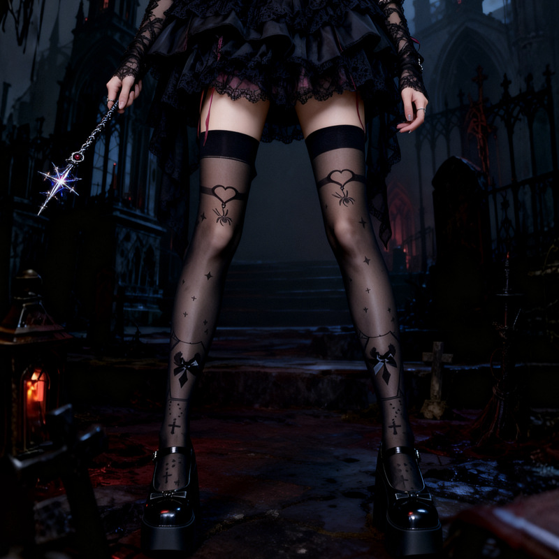 「蛛心噬魂」洛丽塔夜莺少女lolita显瘦暗黑哥特风黑白款高筒袜子