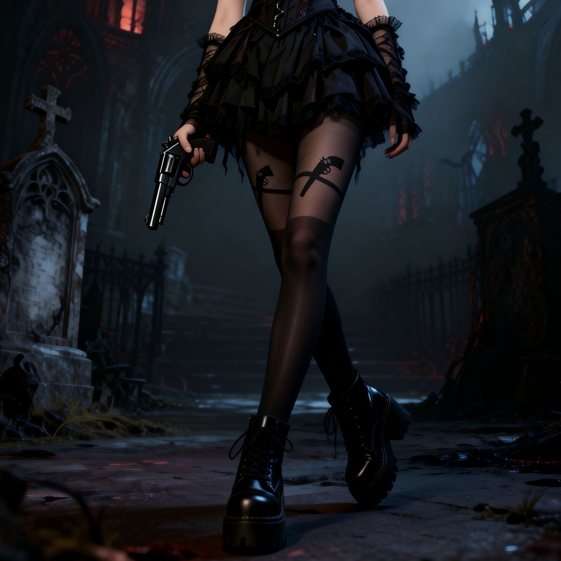 「幽灵幻墓」哥特风十自架洛丽塔高筒袜小腿袜过膝黑色蝴蝶结长筒