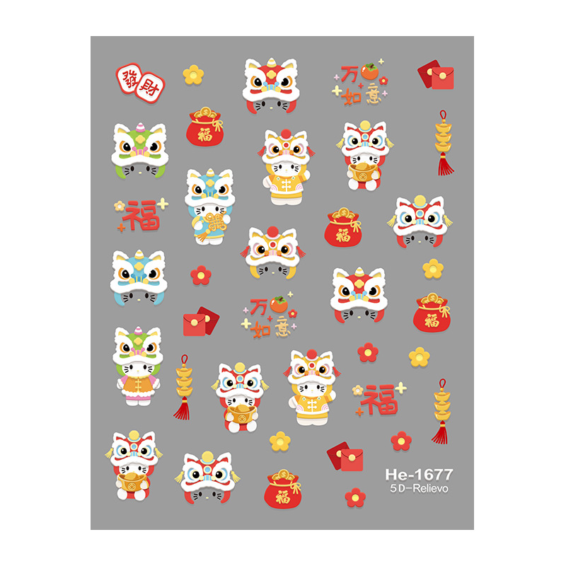 Redanco5D浮雕ins爆款贝壳光美甲贴纸新年兽醒狮立体指甲贴Dr1678
