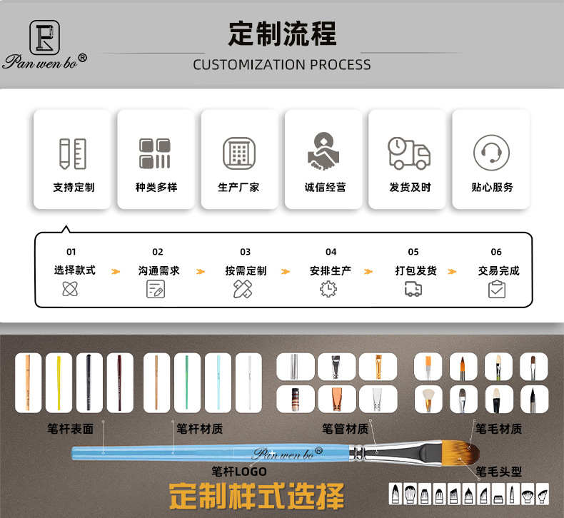 跨境6支原木杆丙烯油画笔刷diy水粉笔水彩画刷丙烯油画笔刷画笔套