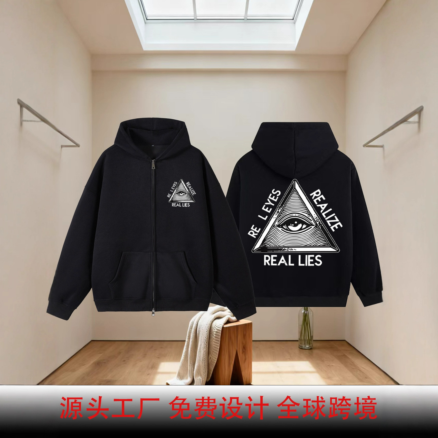 亚马逊爆款黑色三角眼睛印花图案卫衣 加绒连帽拉链开衫工厂直供