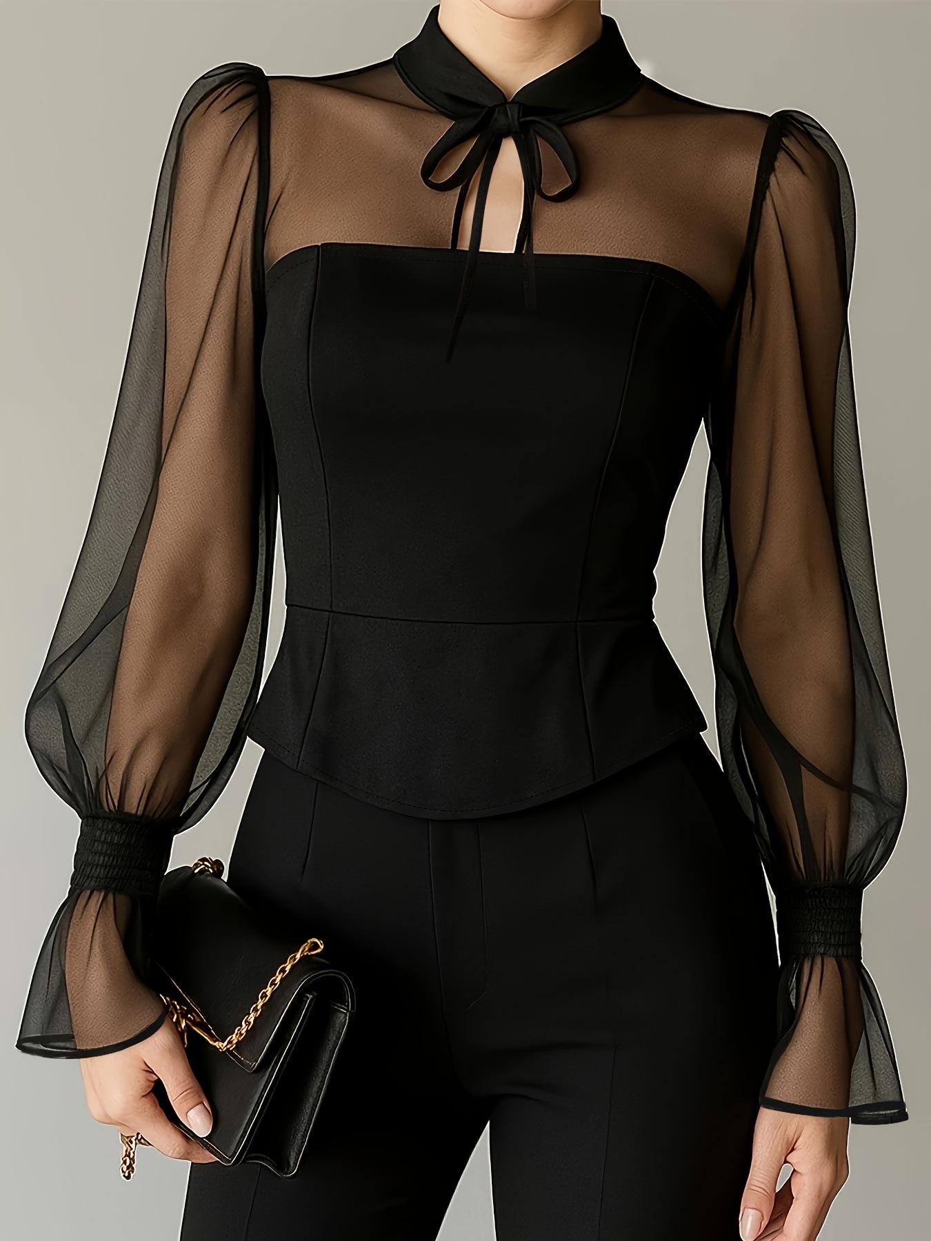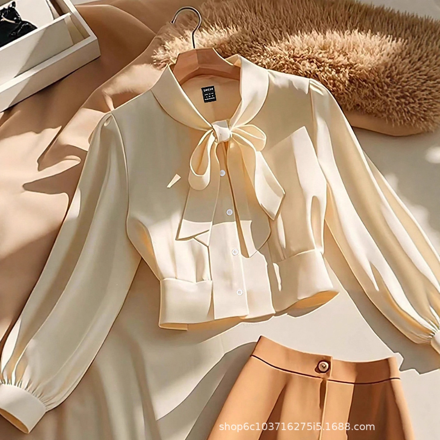 跨境欧美2026年春季新品时尚新款女士优雅泡泡袖领口系带衬衫