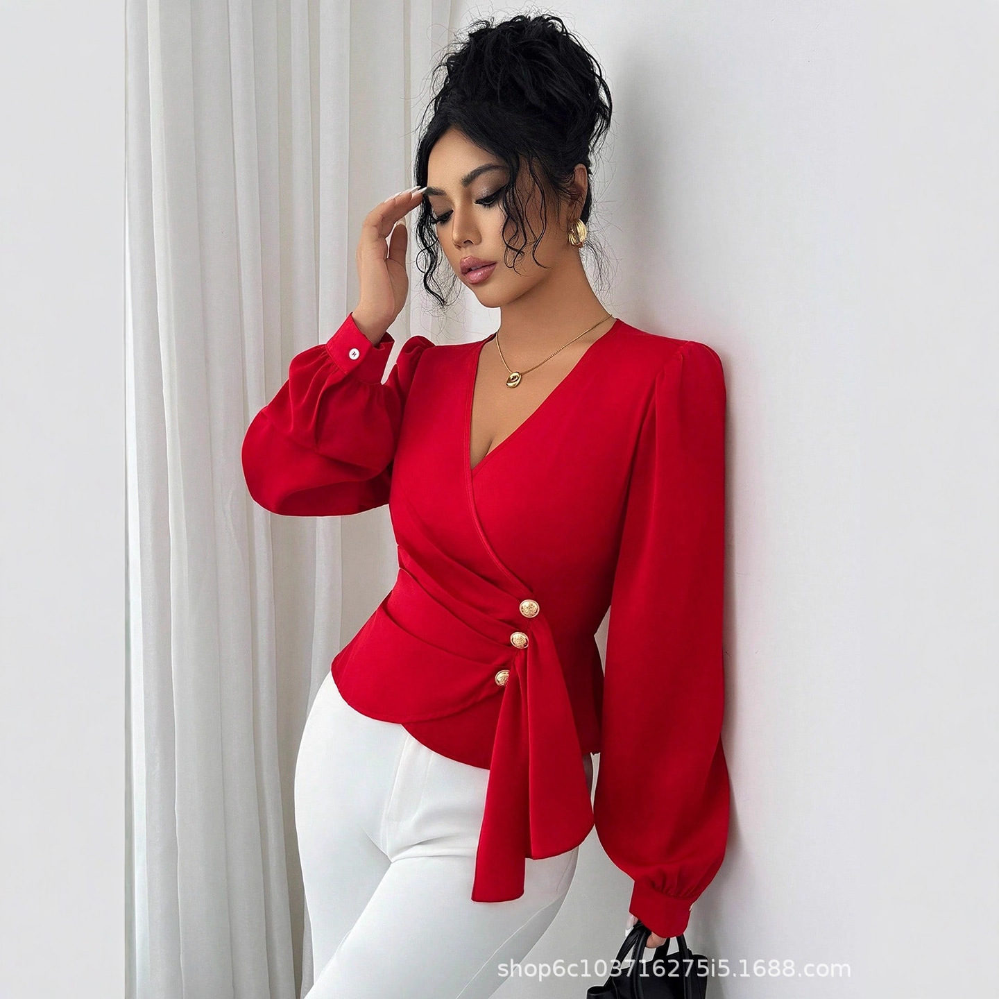 欧美跨境女装2025年法式气质V领T恤女春秋装新款御姐范褶皱长袖衬