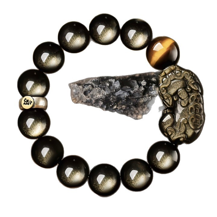 天然黒曜石貔貅ブレスレットシルバー黒曜石ハイエンドメンズ黒曜石バレンタインデーギフトブレスレットタイガーアイストーン