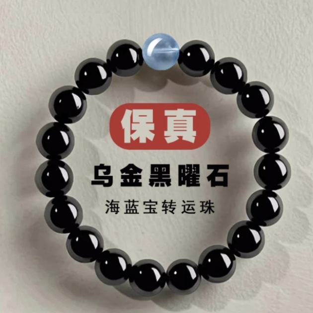 天然黒曜石ブレスレット、紫水晶、アクアマリン、運気を高めるビーズ、手作り仏珠ブレスレット、鑑定書付き、招財ブレスレット