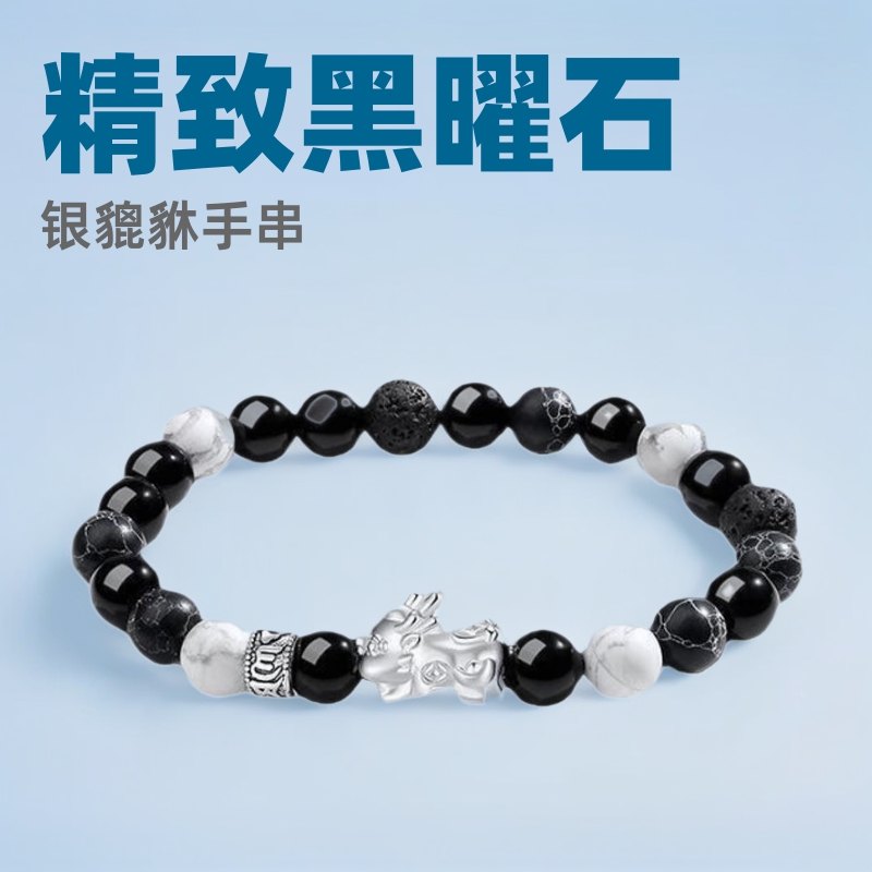 999純銀貔貅カップルモデル男女兼用白猫目黒曜石ジュエリー誕生日プレゼント幸運を呼ぶブレスレット卸売