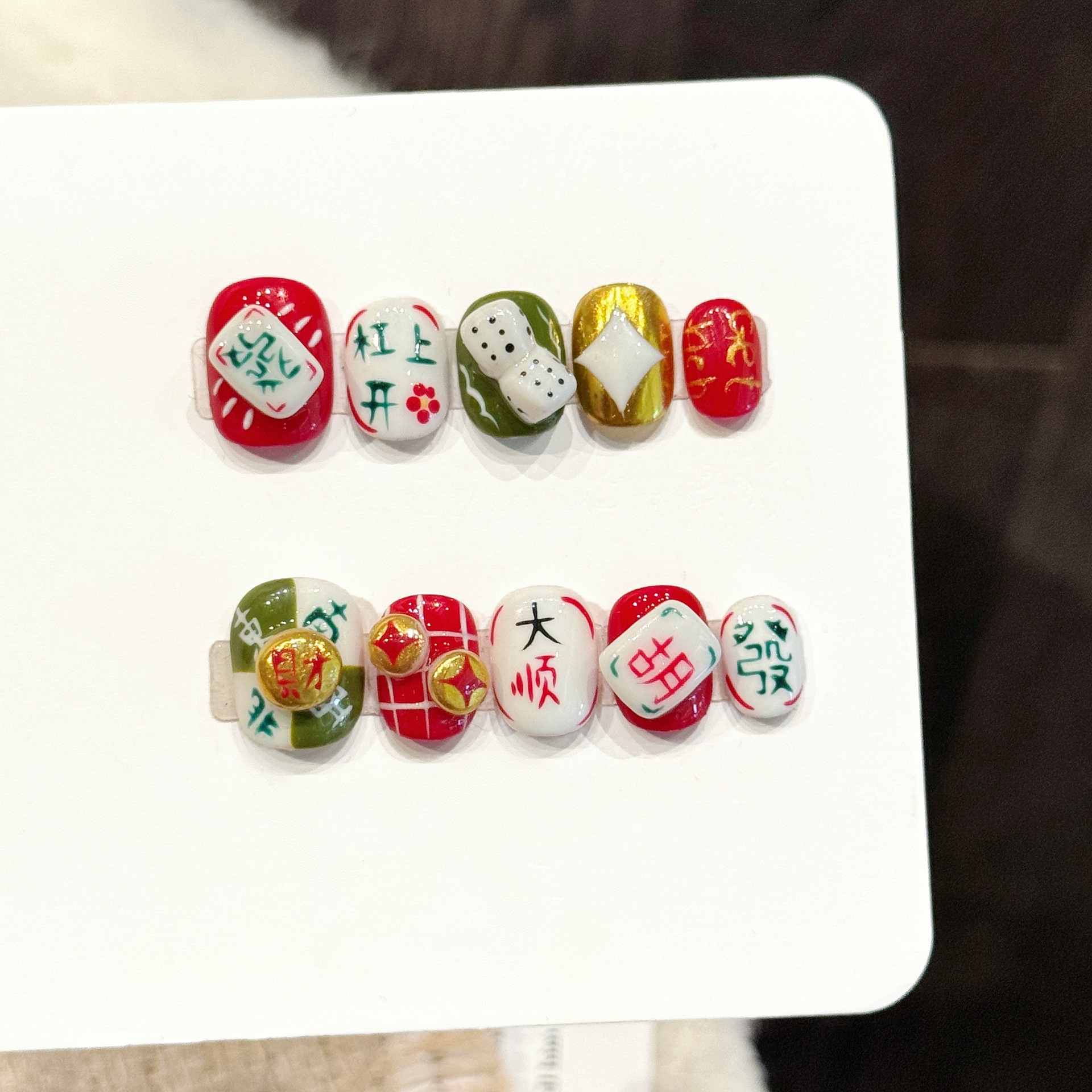 艺禾原创【麻将开运】麻将元素红黄绿纹纯手工穿戴甲开运感美甲片