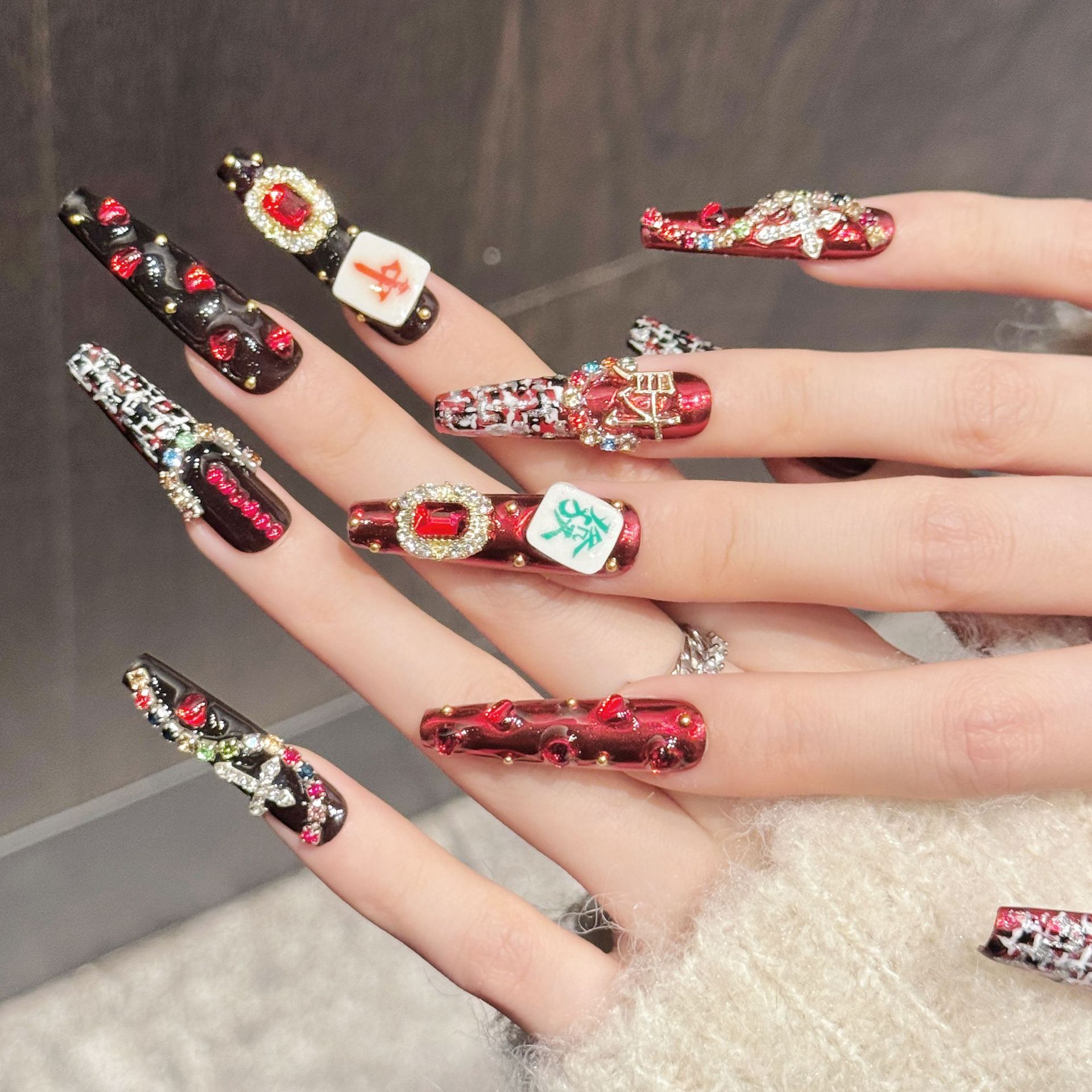 艺禾原创【雀神暴富】红黑麻将钻饰纹纯手工穿戴甲暴富风美甲贴片