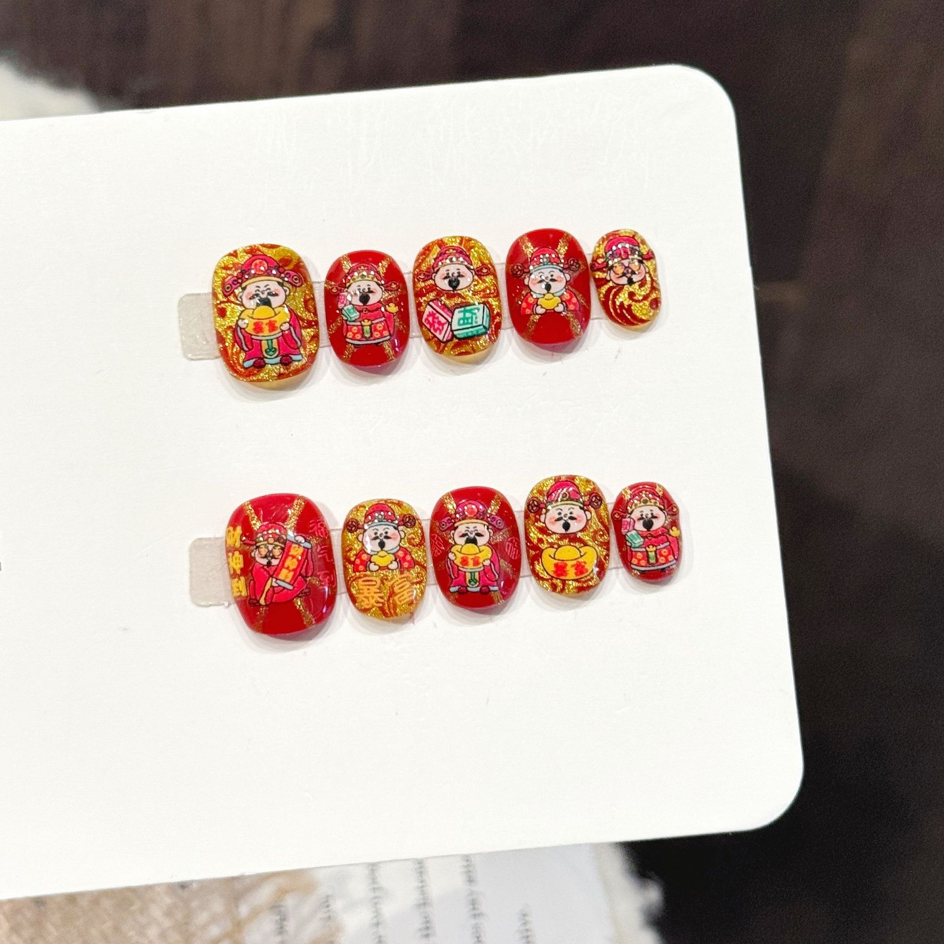 艺禾原创【财神送福】红金财神彩绘纹手工穿戴甲新年财运美甲贴片