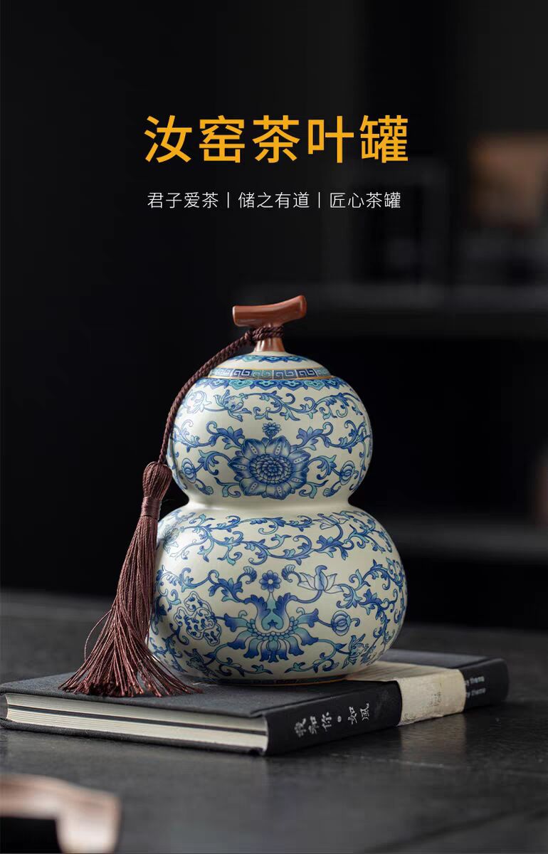 青花汝窑葫芦大号茶叶罐陶瓷中式密封储存罐绿茶白茶普洱茶防潮罐