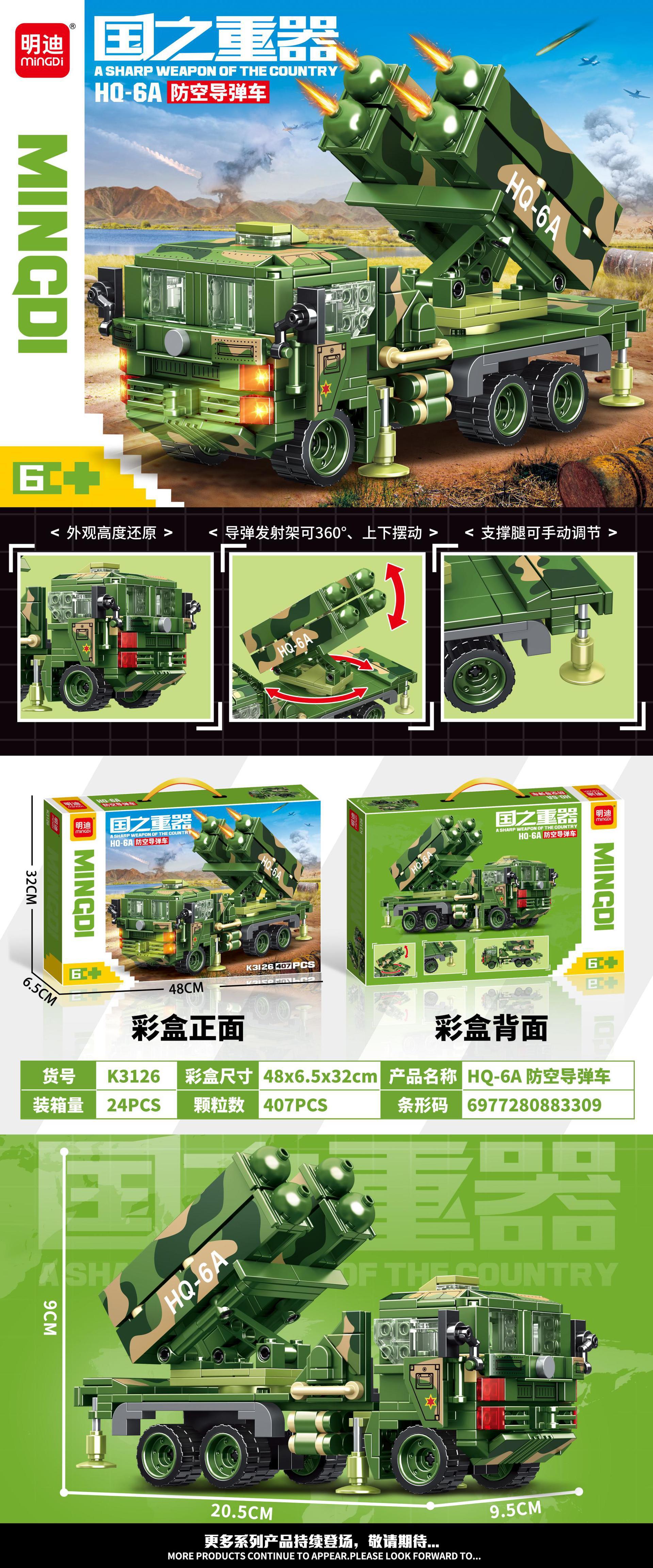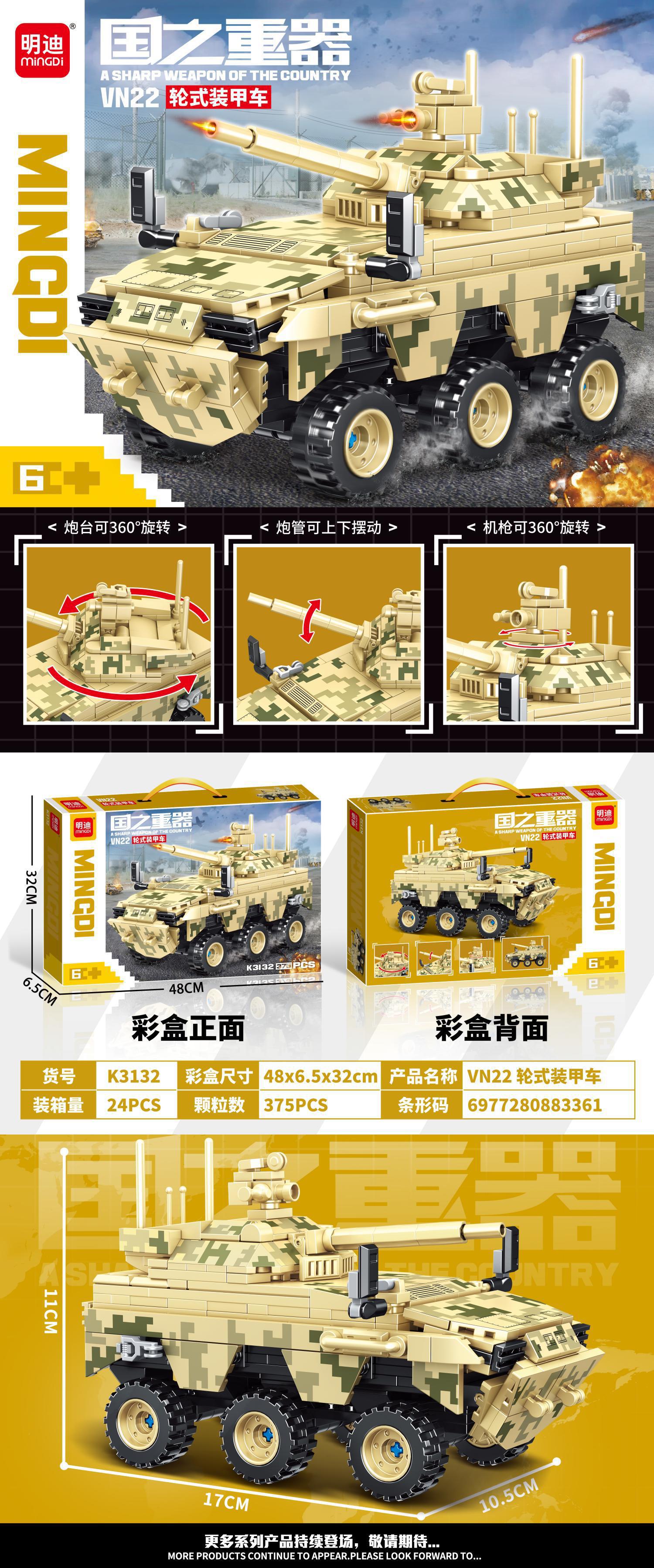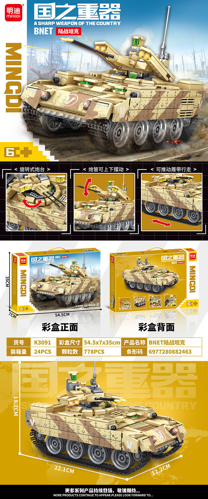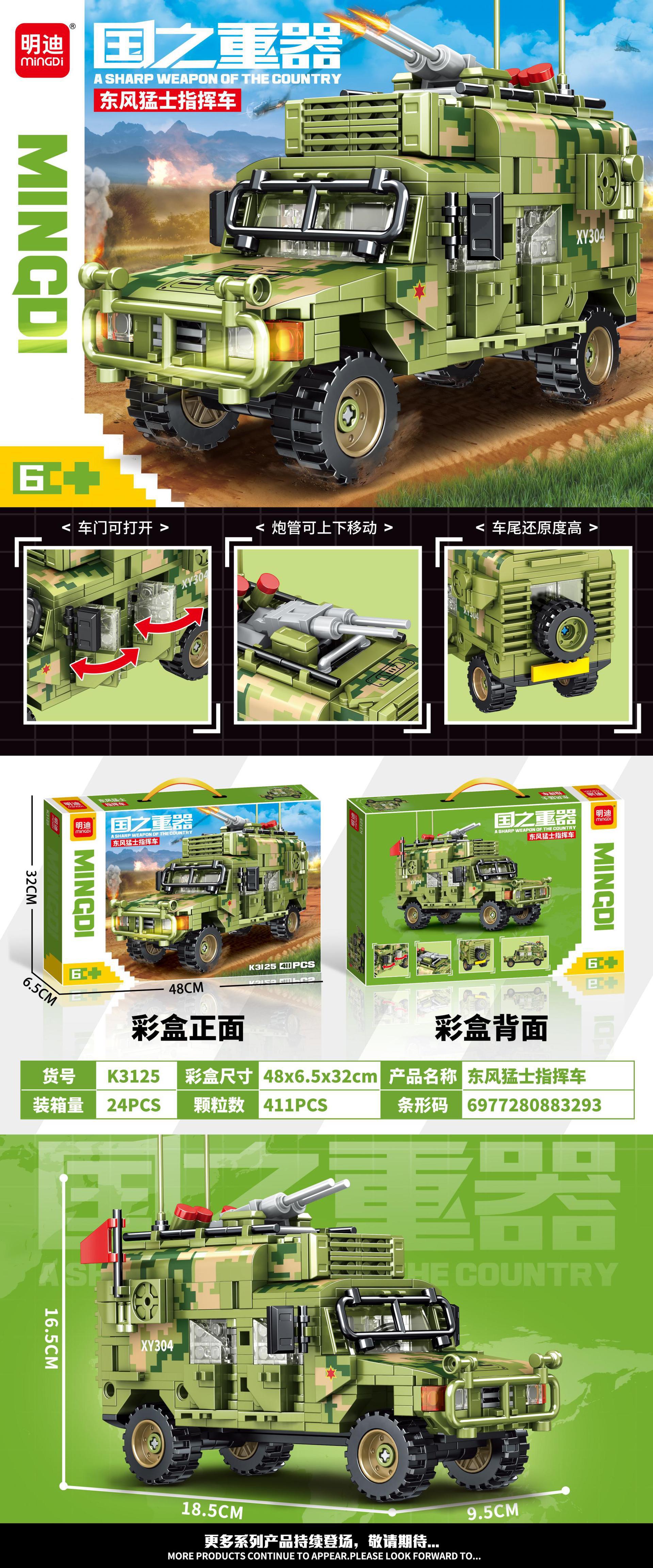 K3091 陆战坦克(大盒),K3092 武装坦克(大盒),K3093 突击装甲车(大盒),K3094 苏33战斗机(大盒),K3095 猛士猎车(大盒),K3096 WZ-E1战斗机(大盒),K3097 装甲突击车(大盒),K3122 901型远洋补给舰(大盒),K3123 076型两栖攻击舰(大盒),K3124 空警600预警机(大盒),K3129 战斗轰炸机(中盒),K3130 UH-60U黑鹰直升机(中盒),K3131 054B型导弹护卫舰(中盒),K3132 VN22轮式装甲车(中盒),K3133 直20武装直升机(中盒),K3134 攻击-II无人机(中盒),K0881 红旗导弹车(中盒),K0882 长剑-10巡航导弹车(中盒),K0883 龙骑兵装甲车(中盒),K0884 自行高炮(中盒),K0885 99式主战坦克(中盒),K0886 094核潜艇(中盒),K0887 战斗机(中盒),K0888 山东舰(中盒),K0890 福建舰(中盒),K0891 6K轰战机(中盒),K0892 悍马(中盒),K0893 导弹驱逐舰(中盒),K0680 红旗2对地导弹车(中盒),K0681 猎鹰突击旋翼机(中盒),K0682 东风17导弹车(中盒),K0683 导弹运载车(中盒),K0917 S-230战斗机(中盒),K0918 MK-35战斗机(中盒),K0919 H-100轰炸机(中盒),K0921 WIE-25截击机(中盒),K0922 H-15战斗机(中盒),K0923 A-61概念机(中盒),K0924 G-20六代机(中盒),K0925 H-JI6轰炸机(中盒),K3125 东风猛士指挥车(中盒),K3126 HQ-6A 防空导弹车(中盒),K3127 BMP-1 装甲车(中盒),K3128 89式1221MT 自行火箭炮(中盒)